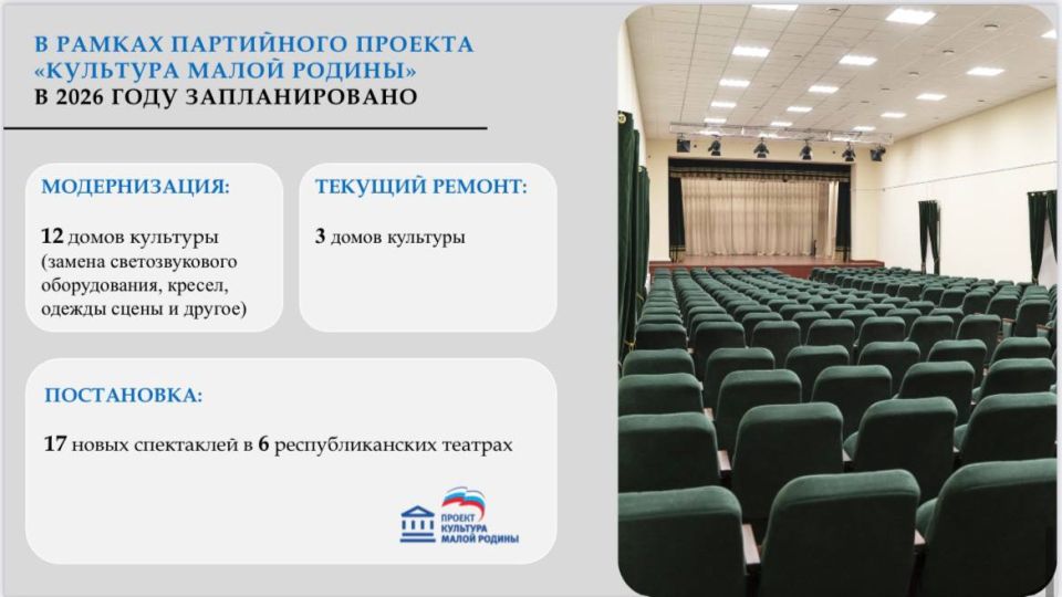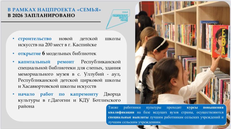 начат капитальный ремонт 2 библиотек, Дома культуры в Каспийске, Детской школы искусств в Кизляре, Русского драматического театра им. М. Горького.