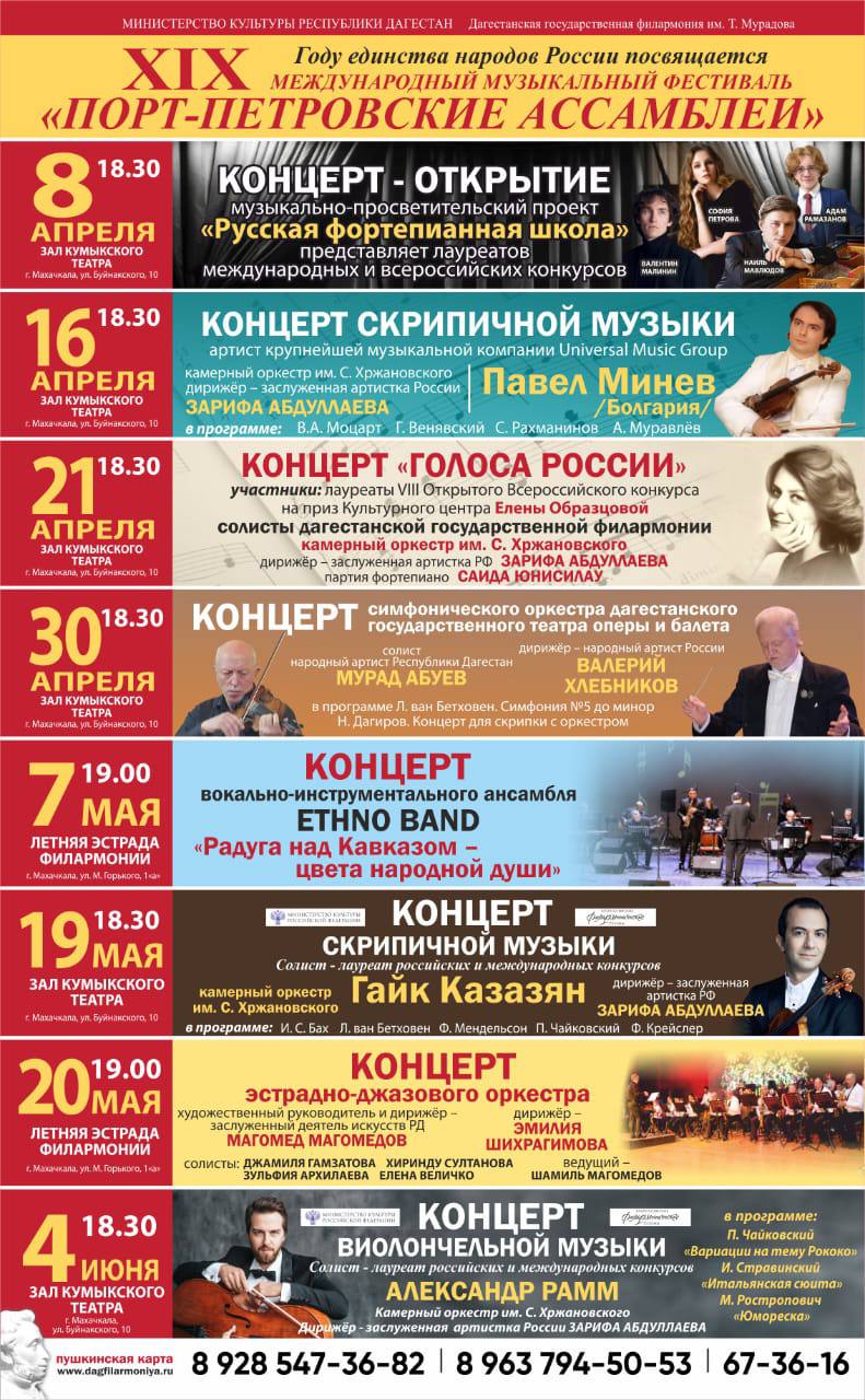 XIX «Порт — Петровские Ассамблеи»— крупнейший международный музыкальный форум Дагестана. Уже второе десятилетие сюда приезжают музыканты из разных уголков мира: России и США, Германии и Аргентины, Норвегии и Испании, Канады, Венгрии, Азербайджана, Турции.