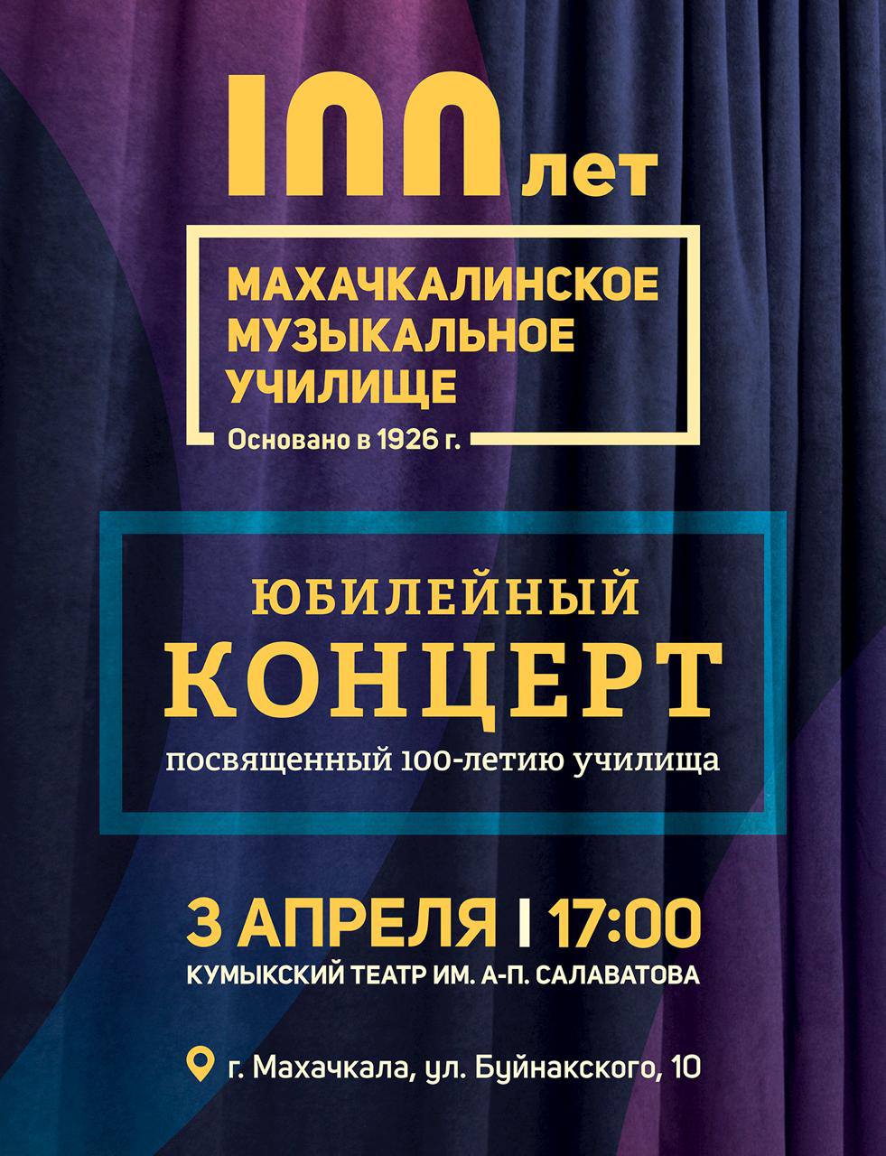 Уже завтра, 3 апреля, в 17:00 в Кумыкском театре состоится торжественный юбилейный вечер, посвященный вековому юбилею Махачкалинского музыкального училища им. Г.А. Гасанова.