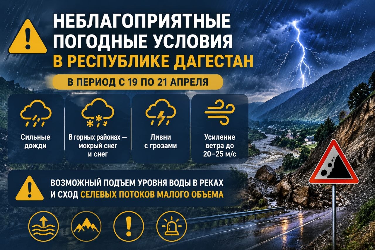 По данным гидрометеорологической службы, в период с 19 по 21 апреля на территории Республики Дагестан ожидаются неблагоприятные погодные условия: сильные дожди, в горных районах — осадки в виде мокрого снега и снега, ливни с грозами, а также усиление ветра до 20–25 м/с. Возможен подъем уровня воды в реках и сход селевых потоков малого объема.
