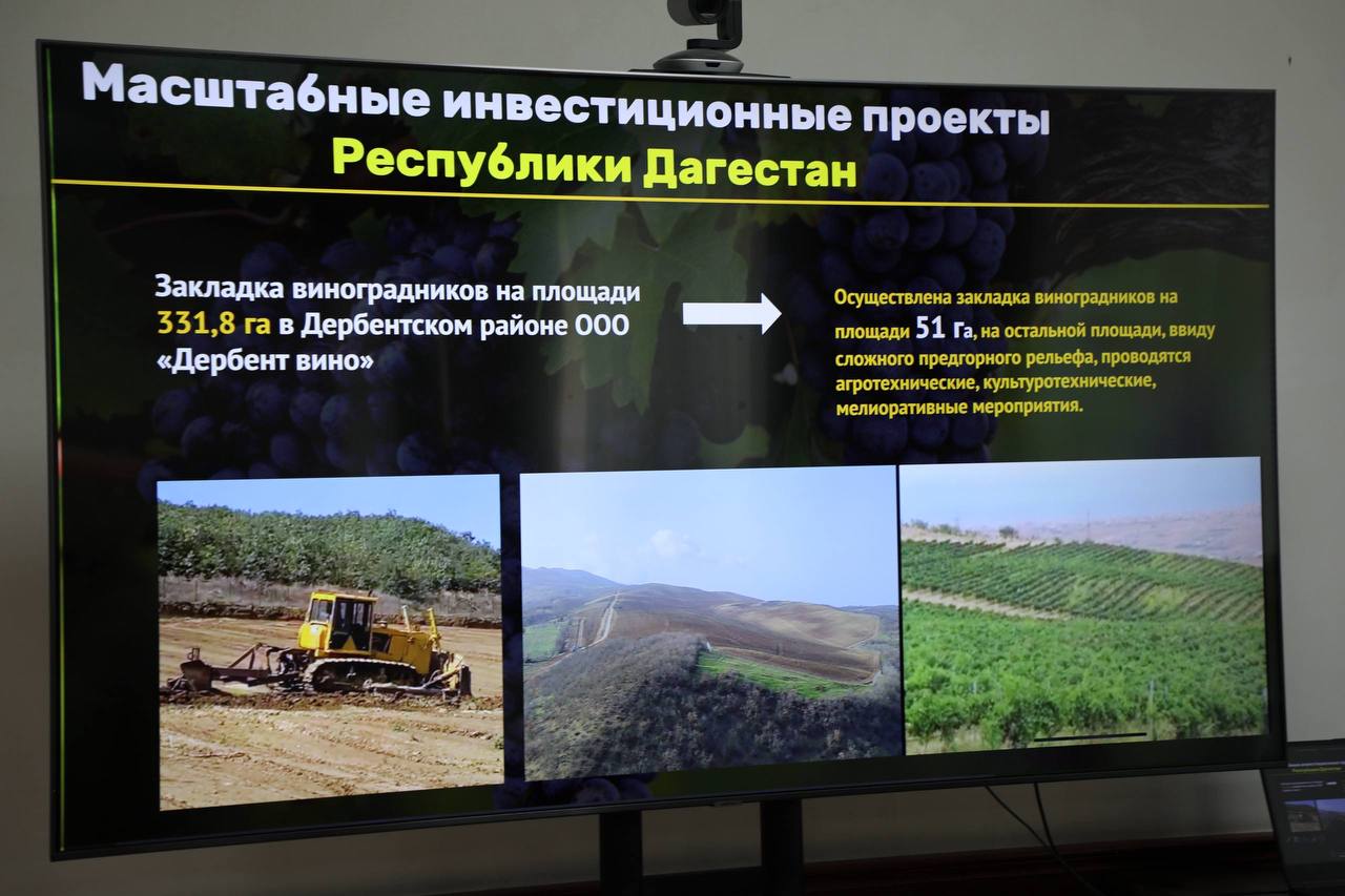 В связи с этим в Дагестане реализуются 4 масштабных инвестпроекта по закладке виноградников с общей земельной площадью 1354,8 га. Осуществление закладки планируется в период 2024-2028 годы, из которых уже заложено более 500 га с капельным орошением (50% плана). Объем вложенных инвестиций превышает 1 млрд 420 млн руб., создано более 200 постоянных рабочих мест: