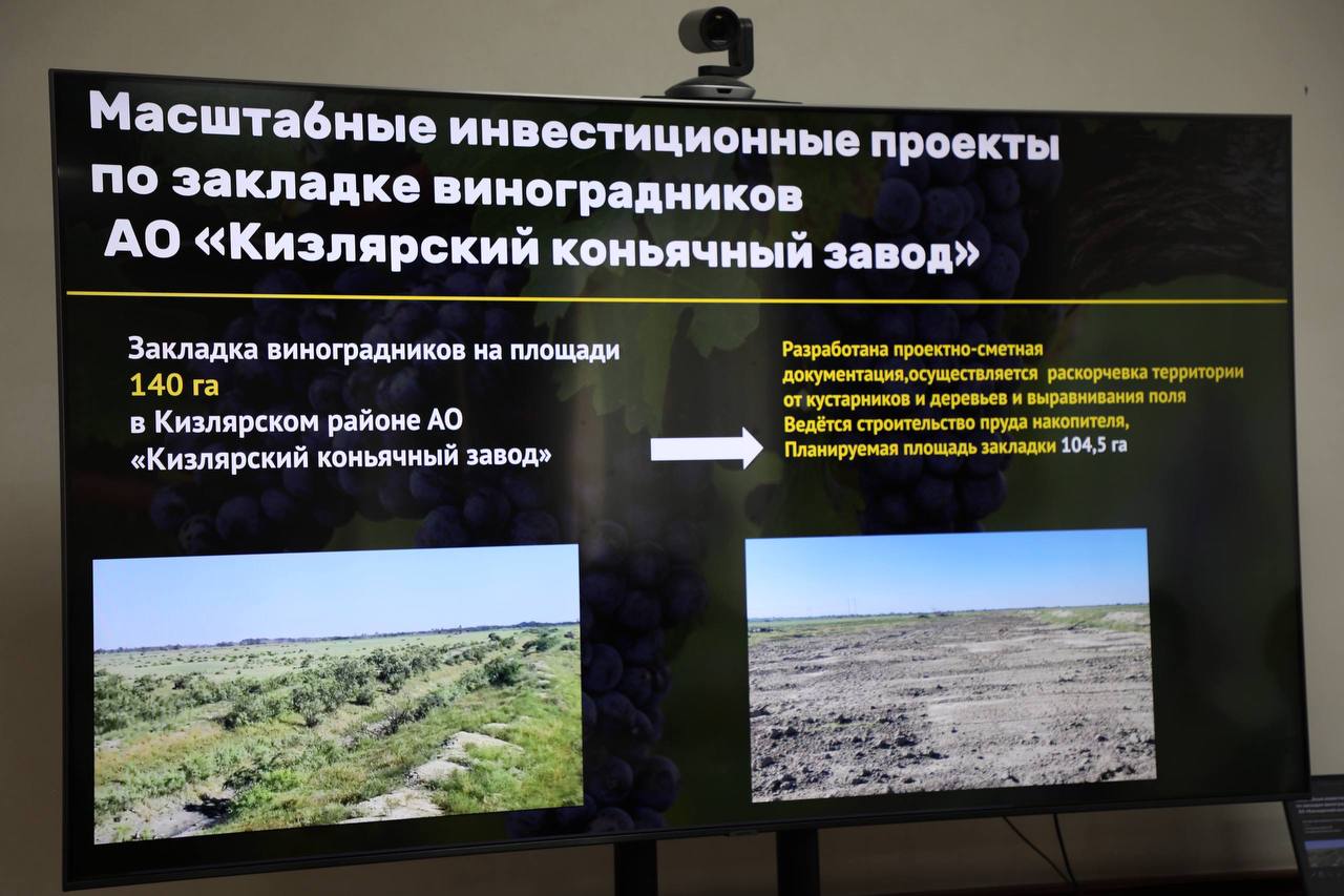 АО «Кизлярский коньячный завод» также реализует МИП «Закладка виноградников на площади 140 га в Кизлярском районе». Срок реализации проекта 2023-2029 гг. Проводятся работы по расчистке оросительного канала Карасуевский, проведены работы по устройству фильтр-пруда и пруда-накопителя.