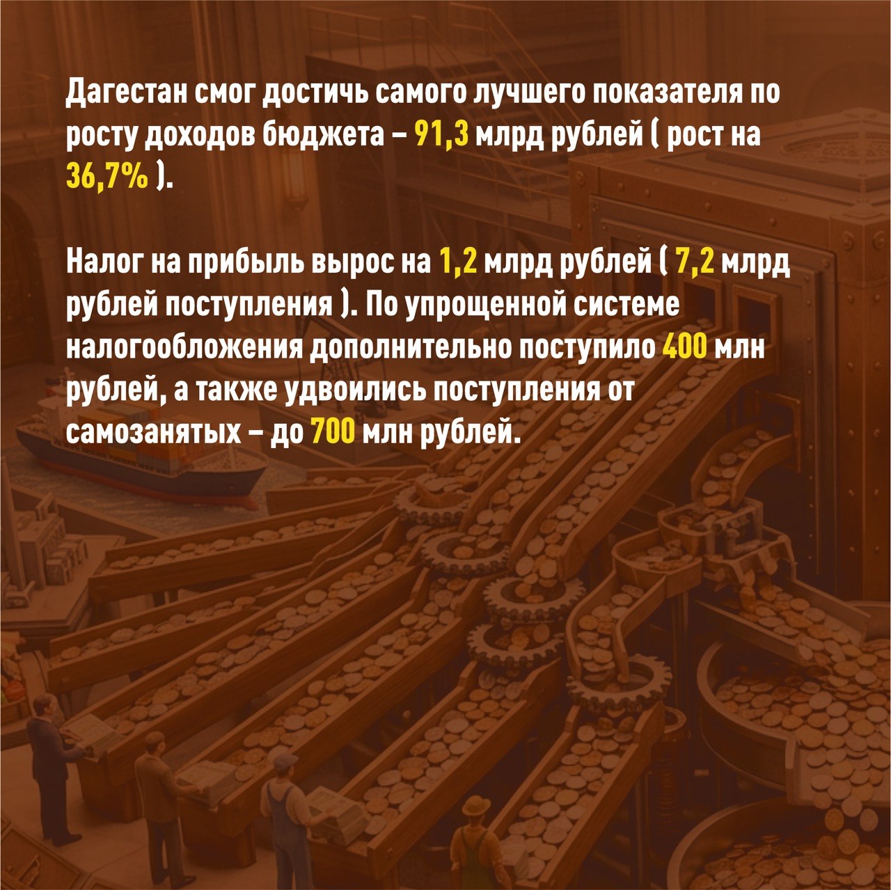 «Рост отмечается практически по всем видам налоговых отчислений. Налог на прибыль вырос на 1,2 млрд рублей и составил 7,2 млрд рублей поступления). По упрощенной системе налогообложения дополнительно поступило 0,4 млрд рублей, удвоились поступления от самозанятых - 0,7 млрд рублей. Неналоговые доходы также приросли на 73,1% и составили 15,5 млрд рублей. Это в значительной мере результат повышения эффективности операционных расходов республиканского бюджета Республики Дагестан», - отметил Абдулмуслимов.