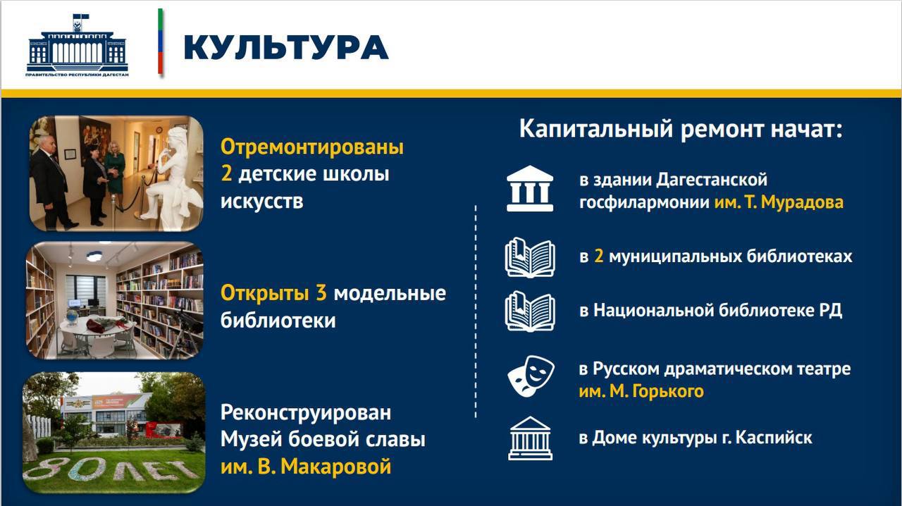 Кроме того, как сообщил глава кабмина, в 2025 году начаты работы в здании Даггосфилармонии им. Т. Мурадовой. Капитальным ремонтом охвачены 2 муниципальные библиотеки, здания Национальной библиотеки РД, Русского драмтеатра им. М. Горького и Дома культуры в г. Каспийске