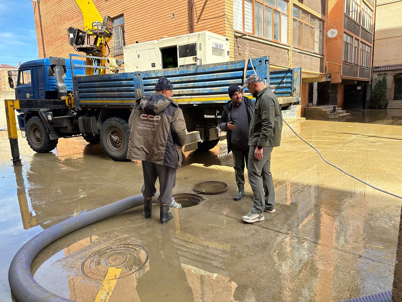 На ул. Хивская со вчерашнего дня были проведены работы по откачке воды для устранения подтоплений. В этом микрорайоне расположено большое количество многоквартирных домов, которые из-за подтоплений были отключены от электроснабжения.