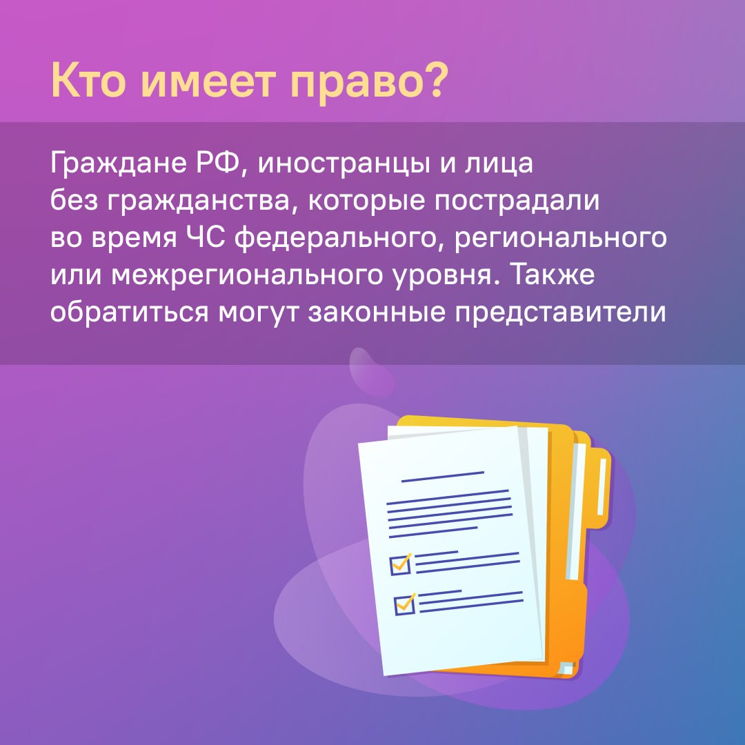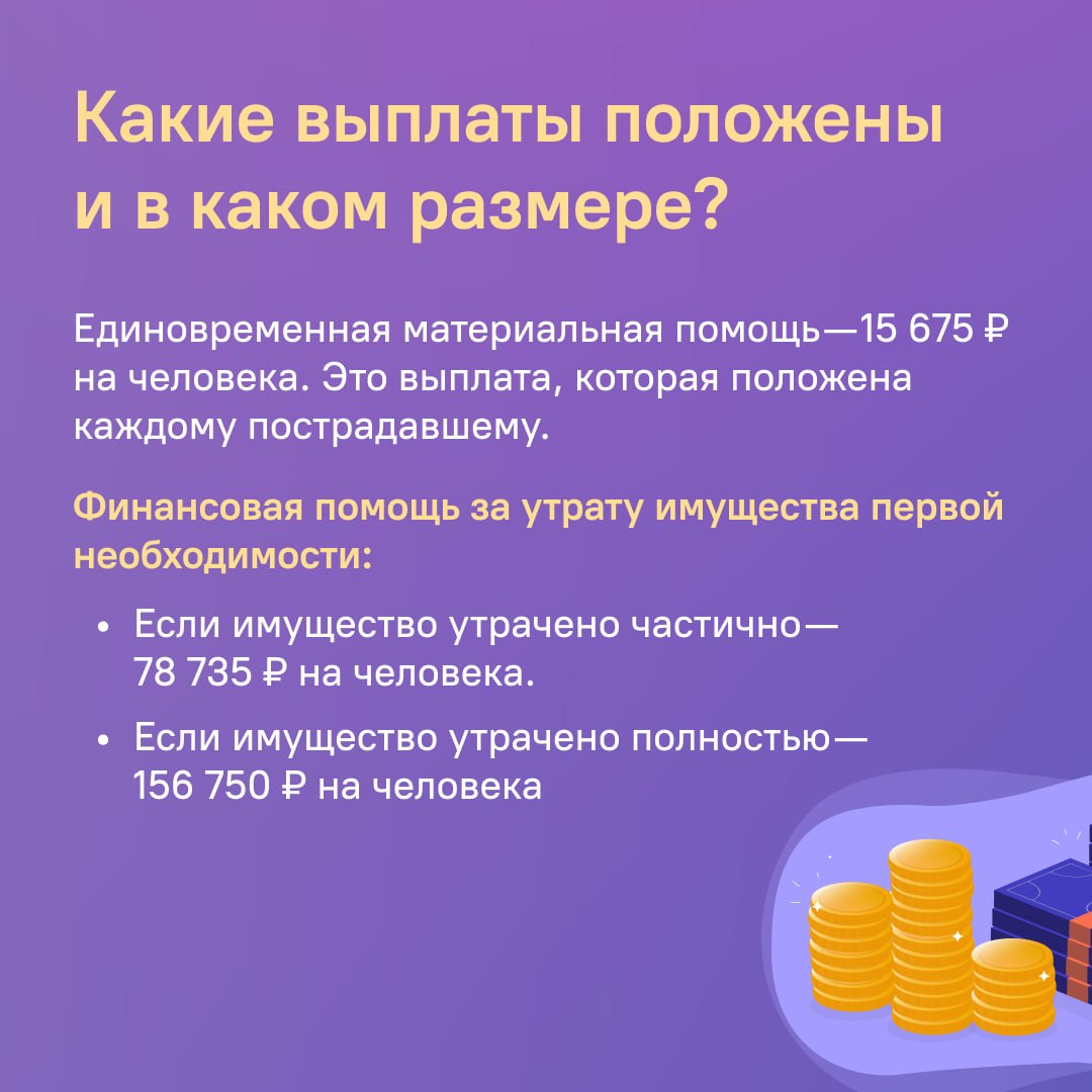 Выплаты положены жителям городов и районов, где официально введён режим ЧС. Подробнее — в карточках.