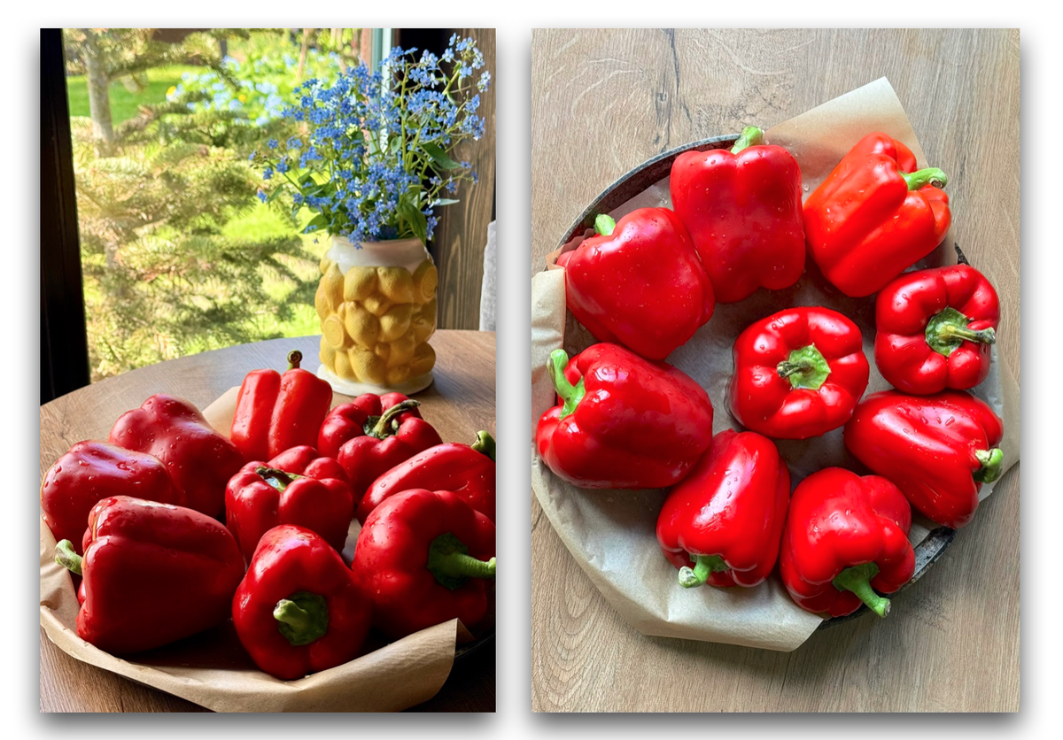 - Нагреть духовку до 200°C и запекать перцы в течение 40–45 минут, пока кожица не потемнеет и не начнёт пузыриться.
