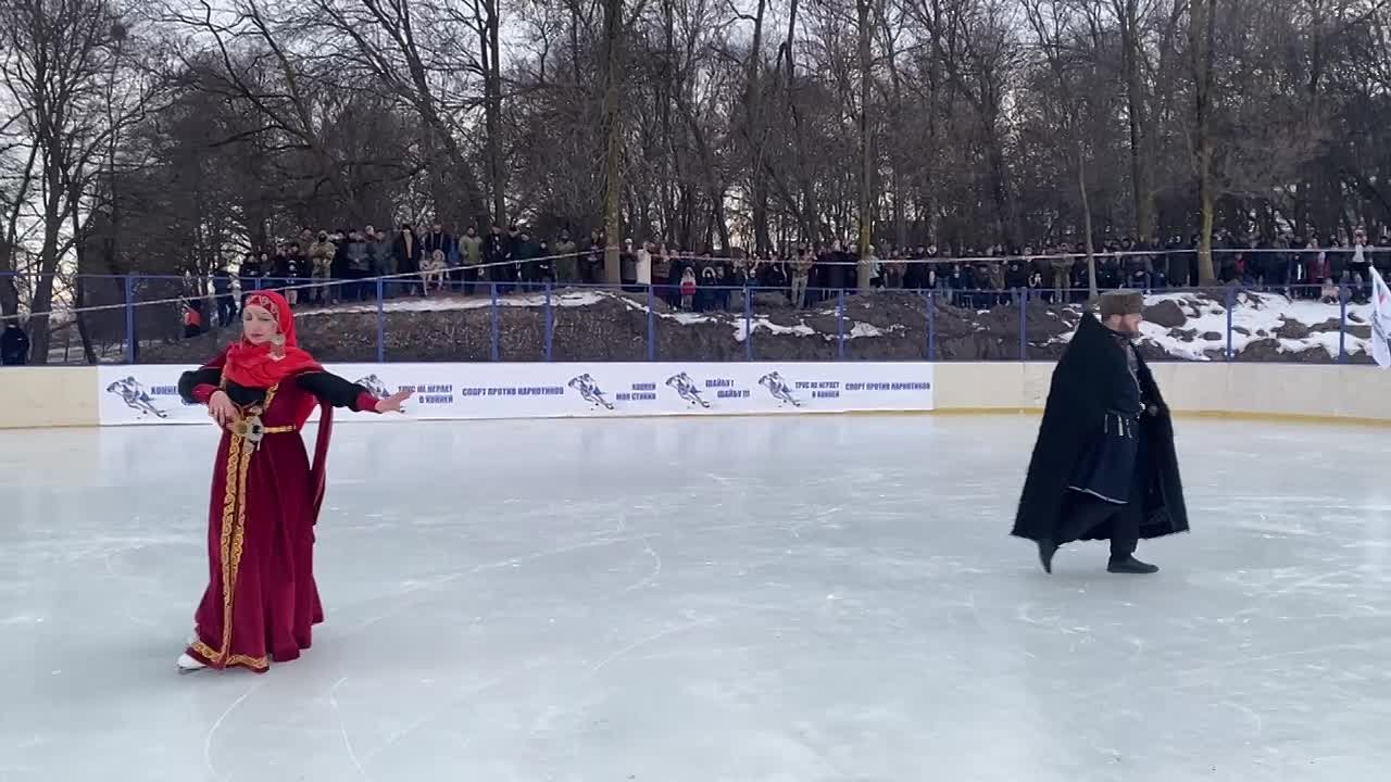 Танец горянки и горца на льду в рамках церемонии открытия турнира «Хоккей на высоте».