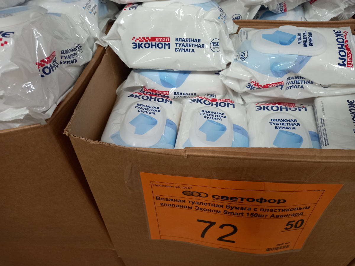 - В магазине Светофор упаковка экономичнных влажных салфеток обойдётся в 72 рубля за 150 штук, с удобным клапаном;