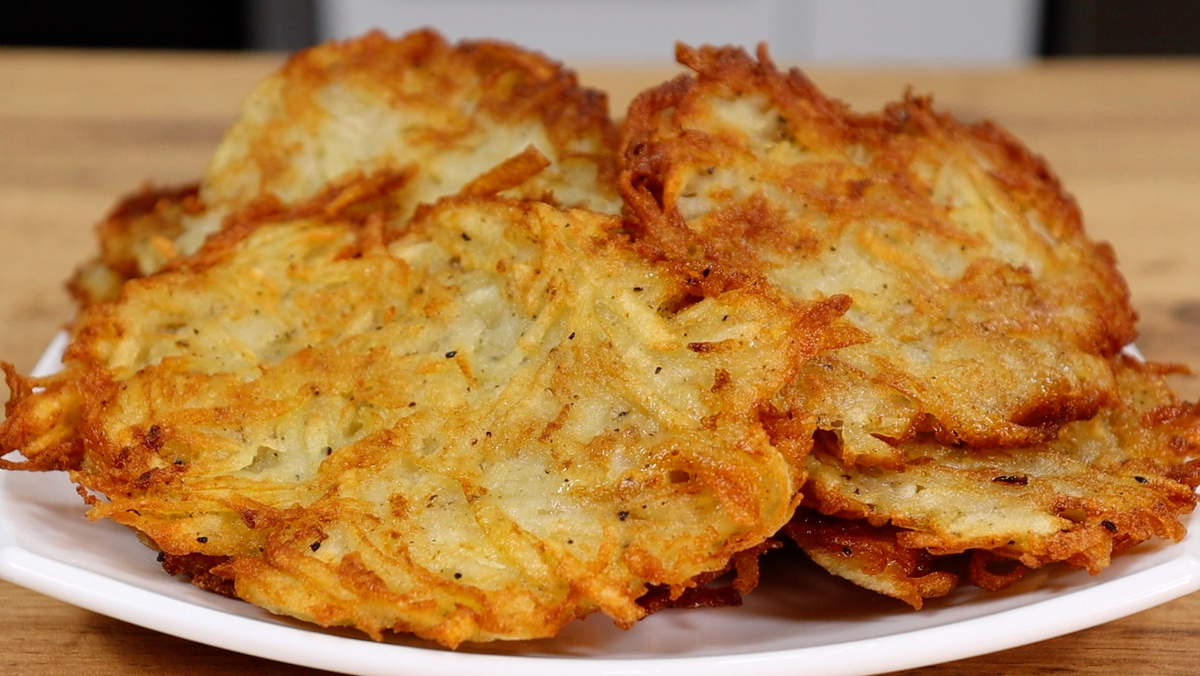 - Приготовление: натираем картофель и лук, добавляем остальные ингредиенты, хорошо перемешиваем и жарим до золотистой корочки.