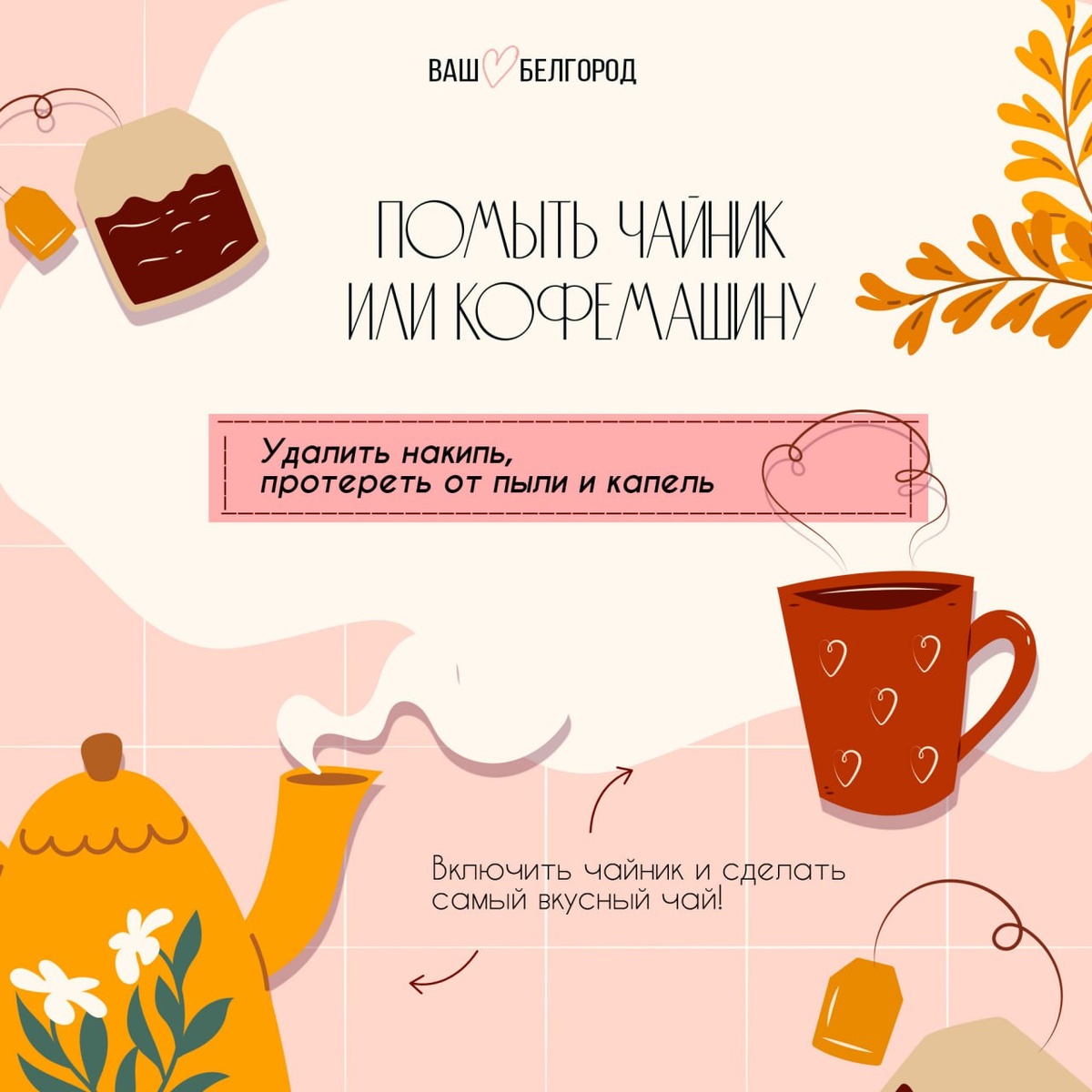 Настало время уделить внимание нашим верным помощникам на кухне. Сегодня ваш чек-лист включает важную задачу — очистку чайника или кофемашины!