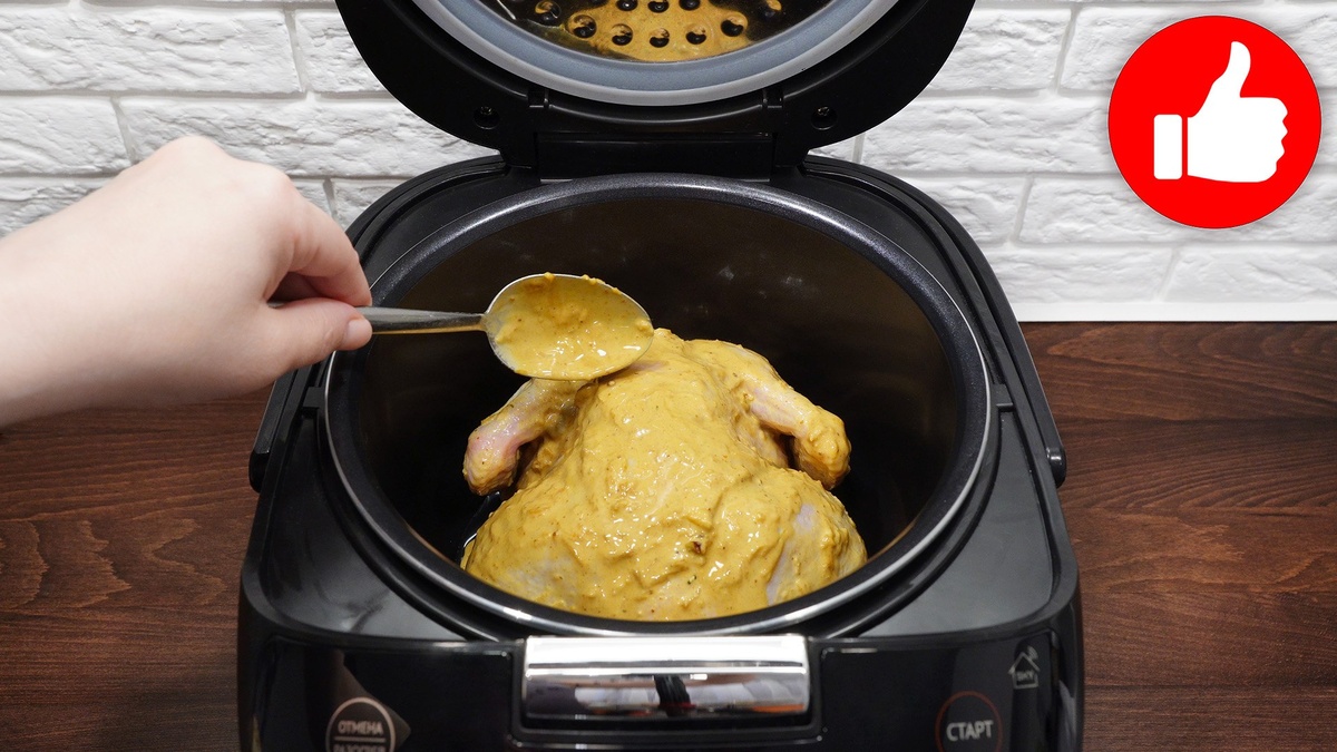 Теперь пришло время готовить. В чашу мультиварки налейте подсолнечное масло и положите курицу грудкой вниз. Добавьте оставшийся маринад для максимального вкуса. Установите режим «Выпечка» или «Мультиповар» при температуре 130 градусов и готовьте в течение 1 час 10 минут. Не забудьте перевернуть курицу спустя 35 минут, чтобы она равномерно пропеклась и стала золотистой.