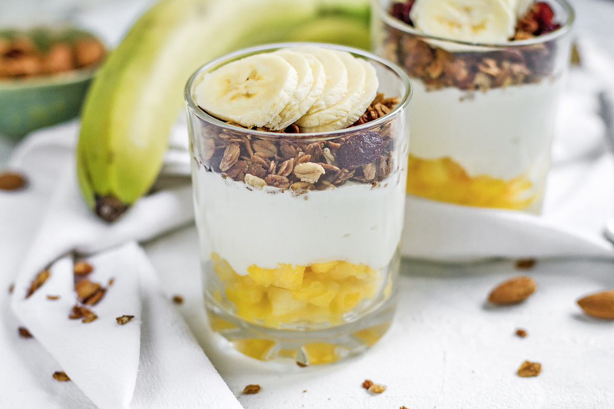 Шаг 2: Чтобы подать гранолу стильно, используйте стаканы. На дно каждого стакана уложите кусочки ананаса, затем добавьте йогурт, потом посыпьте гранолой и украсьте кружочками бананов.