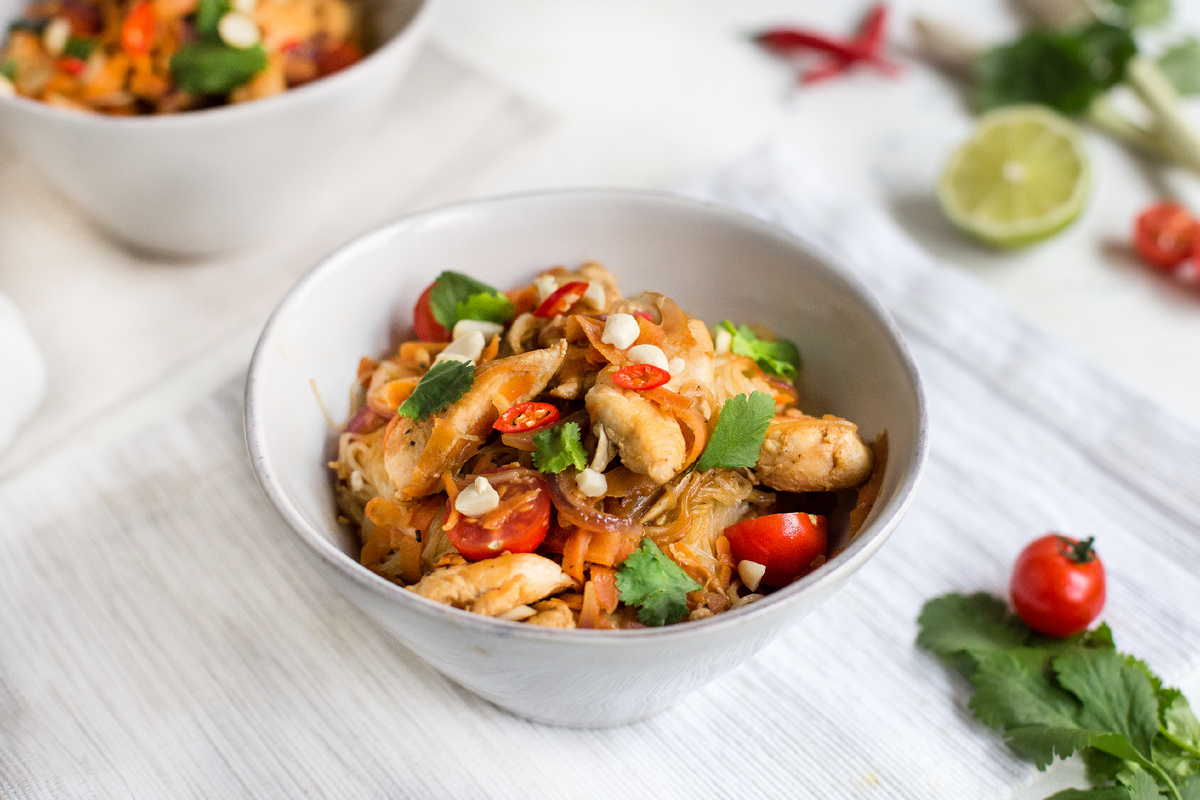 Шаг 4: В сковороду к курице добавьте приготовленную фунчозу и помидоры черри, хорошо перемешайте и прогрейте 1-2 минуты. Подавайте сразу, посыпав арахисом.