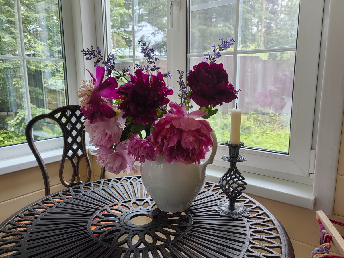 Пионы могут стать настоящим украшением вашего сада. Вместо классических ваз можно использовать старый алюминиевый бидон, который станет оригинальным акцентом и подчеркнёт нежные лепестки цветов.