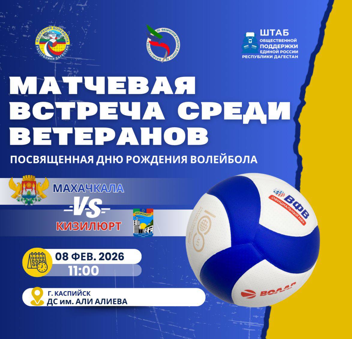 08 февраля — матчевая встреча ветеранов в Каспийске, посвящённая Дню рождения волейбола.