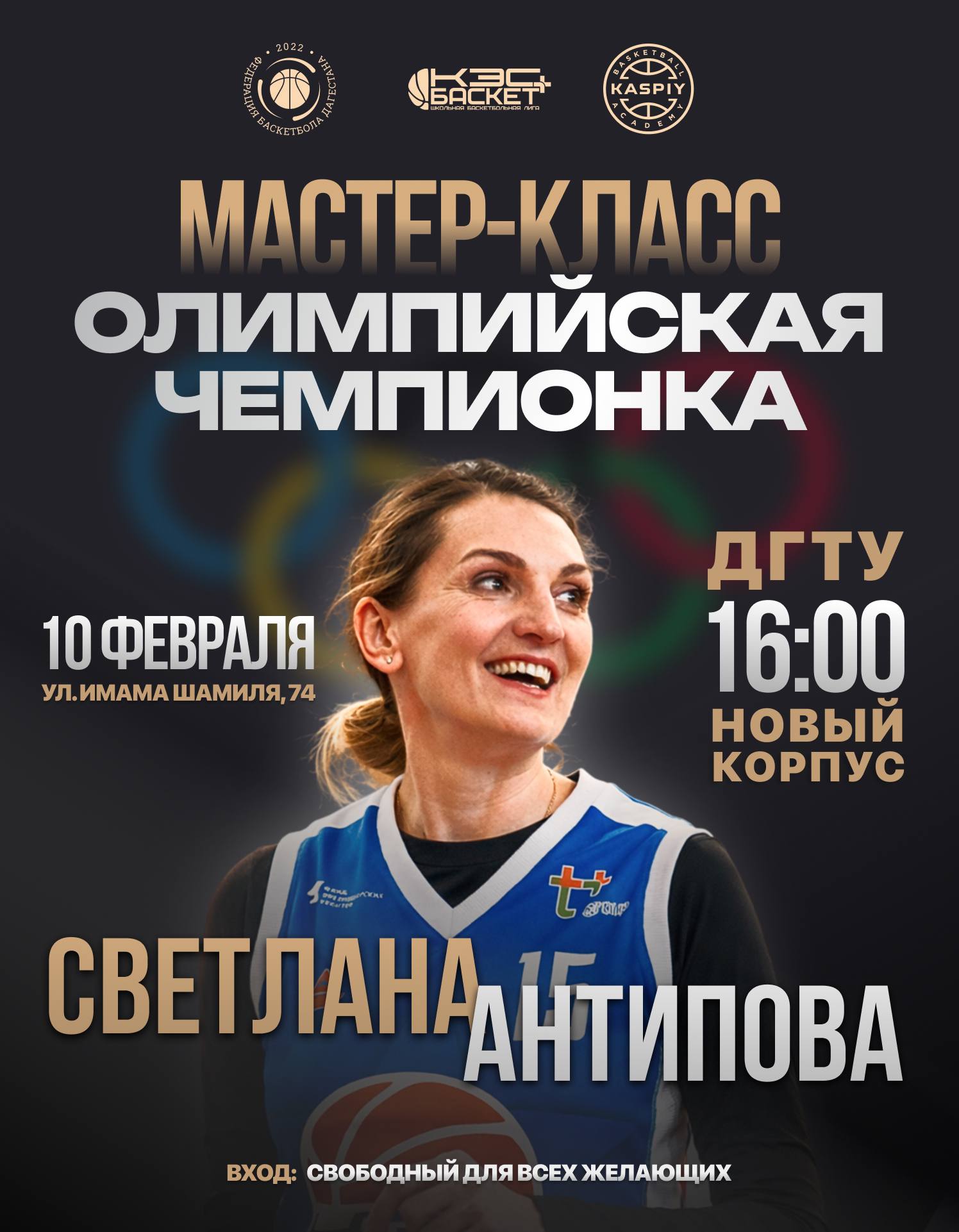 10 февраля в 16:00 в спортивном зале Дагестанского государственного технического университета состоится открытый мастер-класс по баскетболу. И проведет его легенда женского росссийского баскетбола — Антипова Севтлана Александровна:
