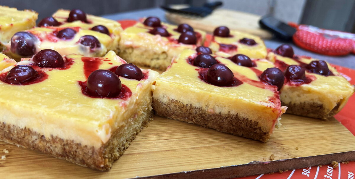 Все ингредиенты для начинки нужно смешать до получения однородной массы и вылить на слегка остывшее тесто. Вернуть форму в духовку и выпекать еще 20 минут, пока начинка не схватится.