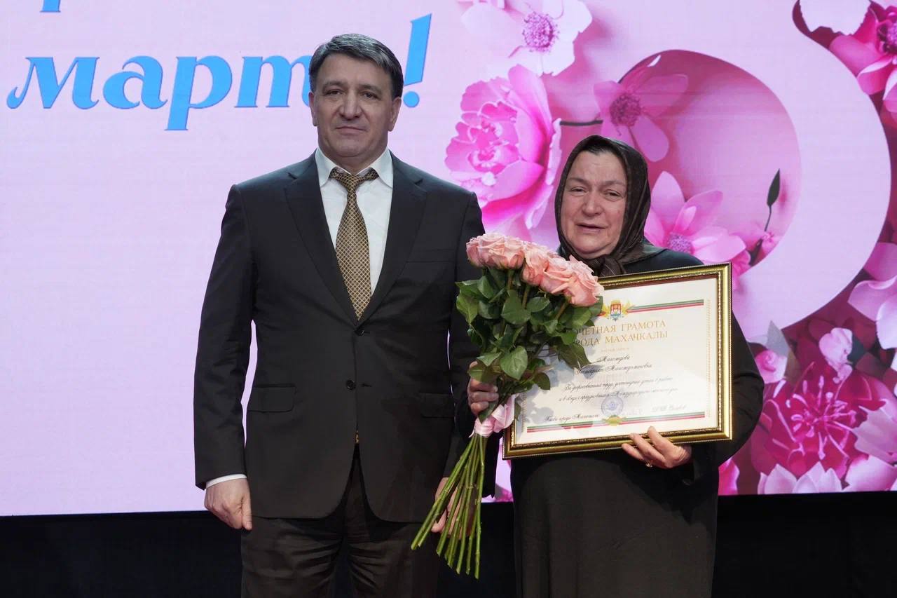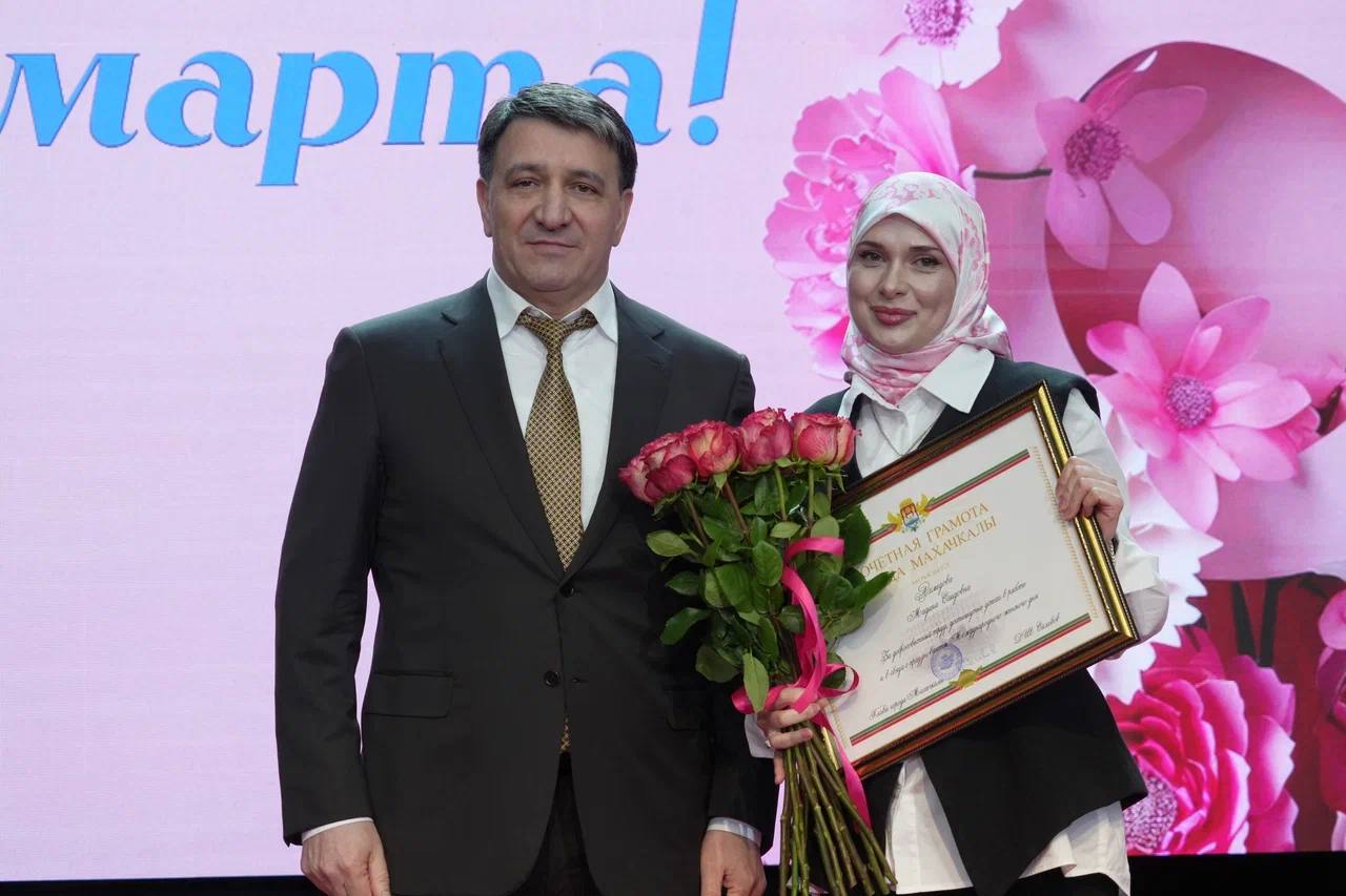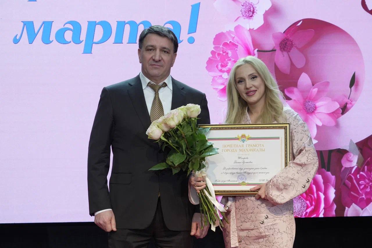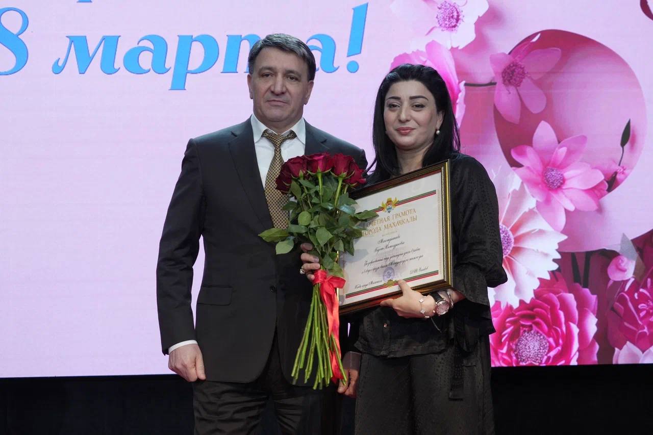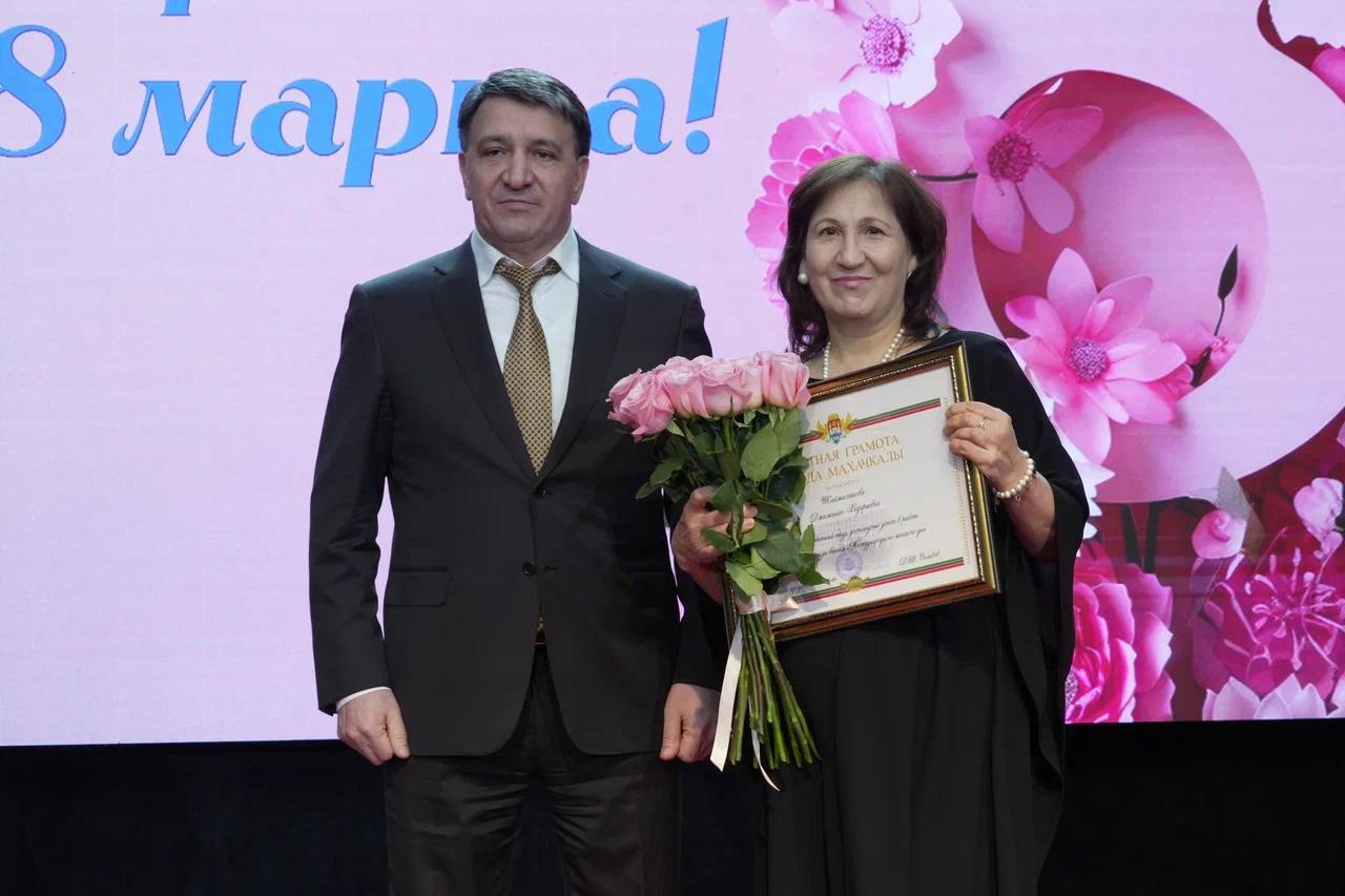 Фоторепортаж с церемонии награждения главой Махачкалы на праздничном концерте, посвящённом Международному женскому дню.
