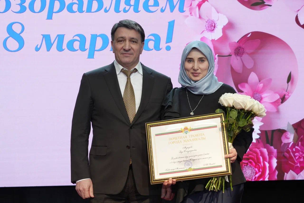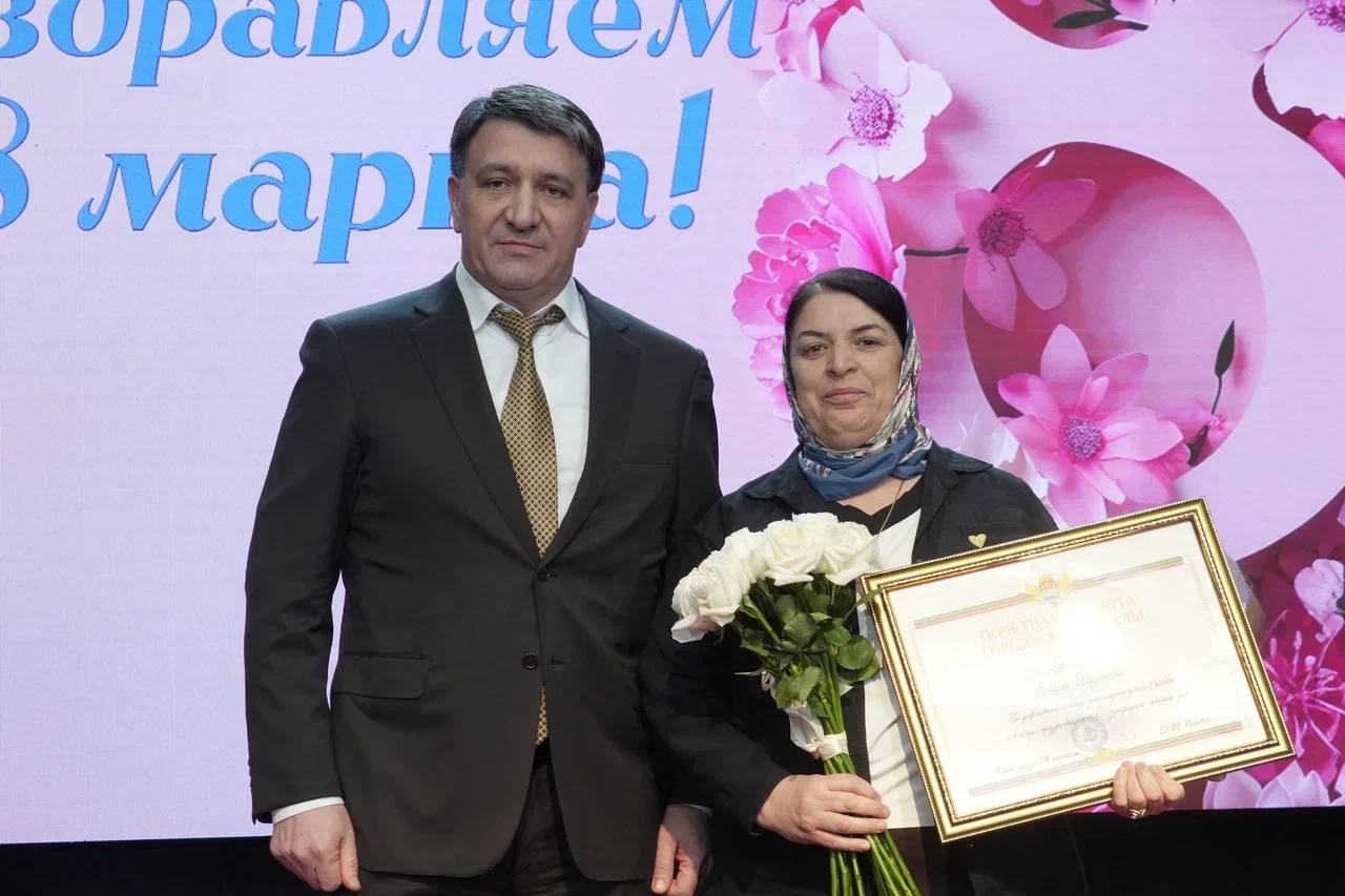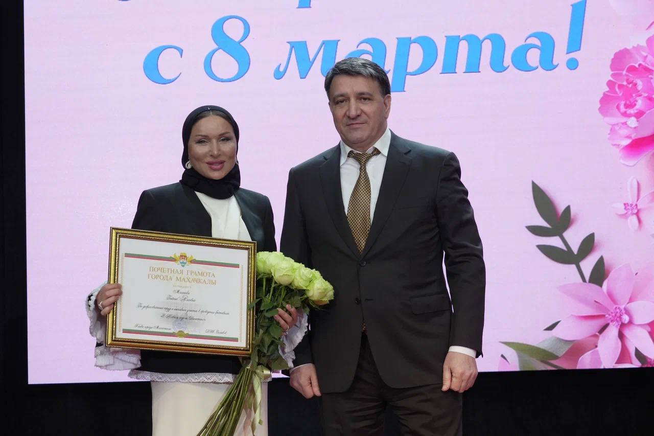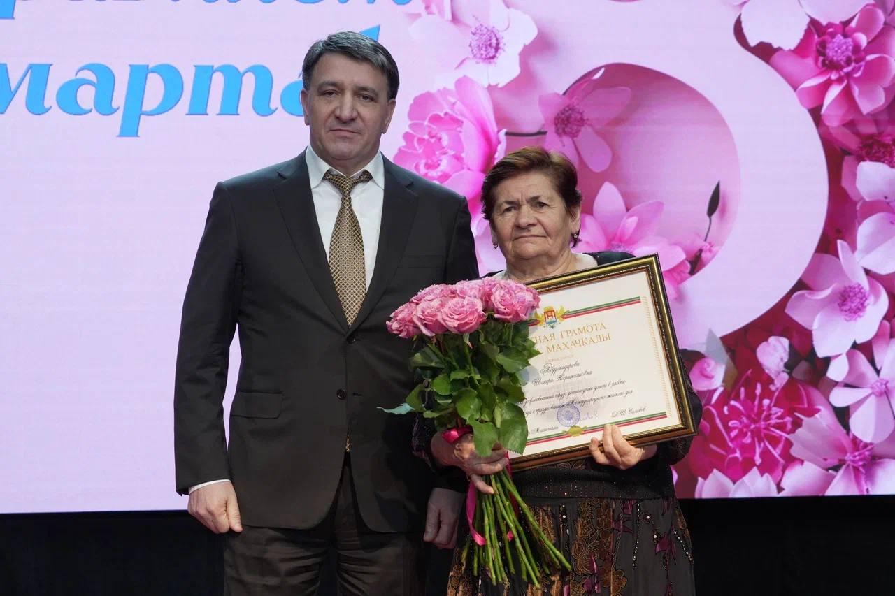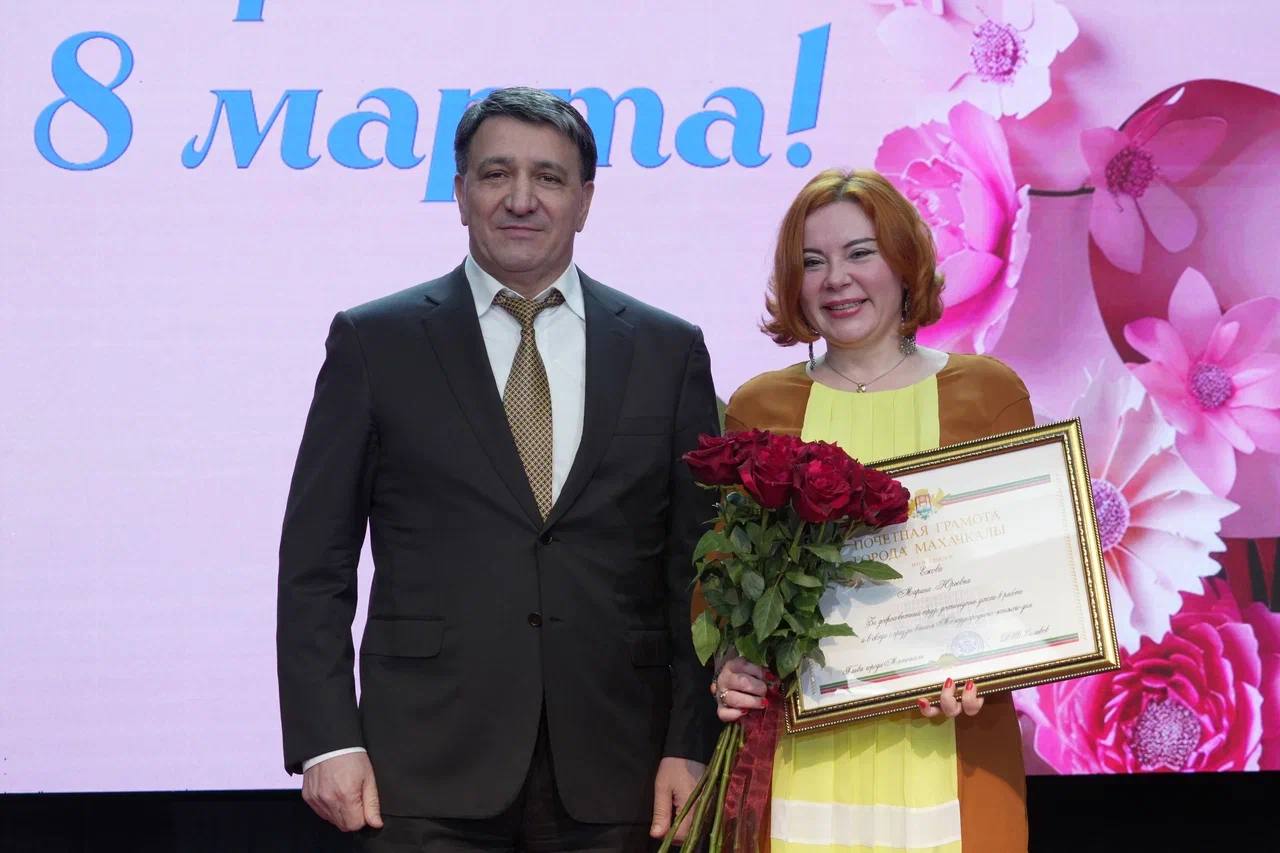 Фоторепортаж с церемонии награждения главой Махачкалы на праздничном концерте, посвящённом Международному женскому дню.