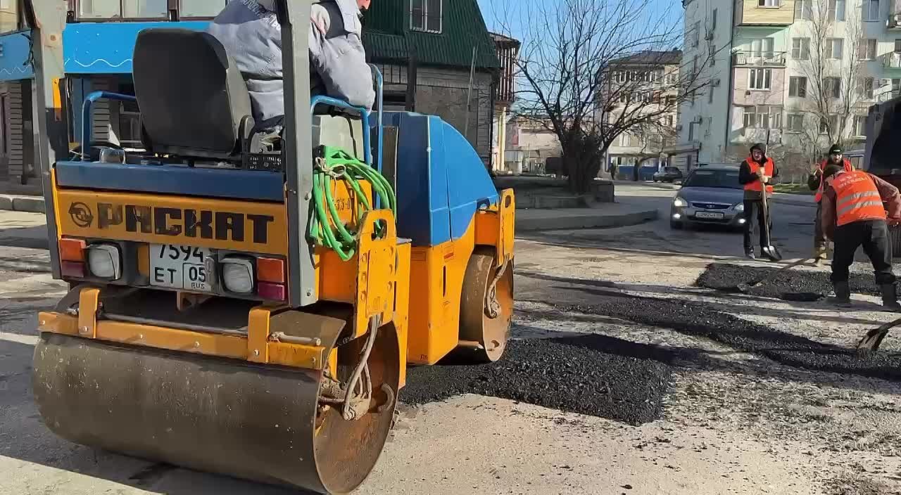Ямочный ремонт на улице Хизроева в Махачкале. Здесь одновременно ведутся несколько этапов работ: одна бригада занимается подготовкой основания, после чего другая бригада приступает к укладке асфальтового покрытия.