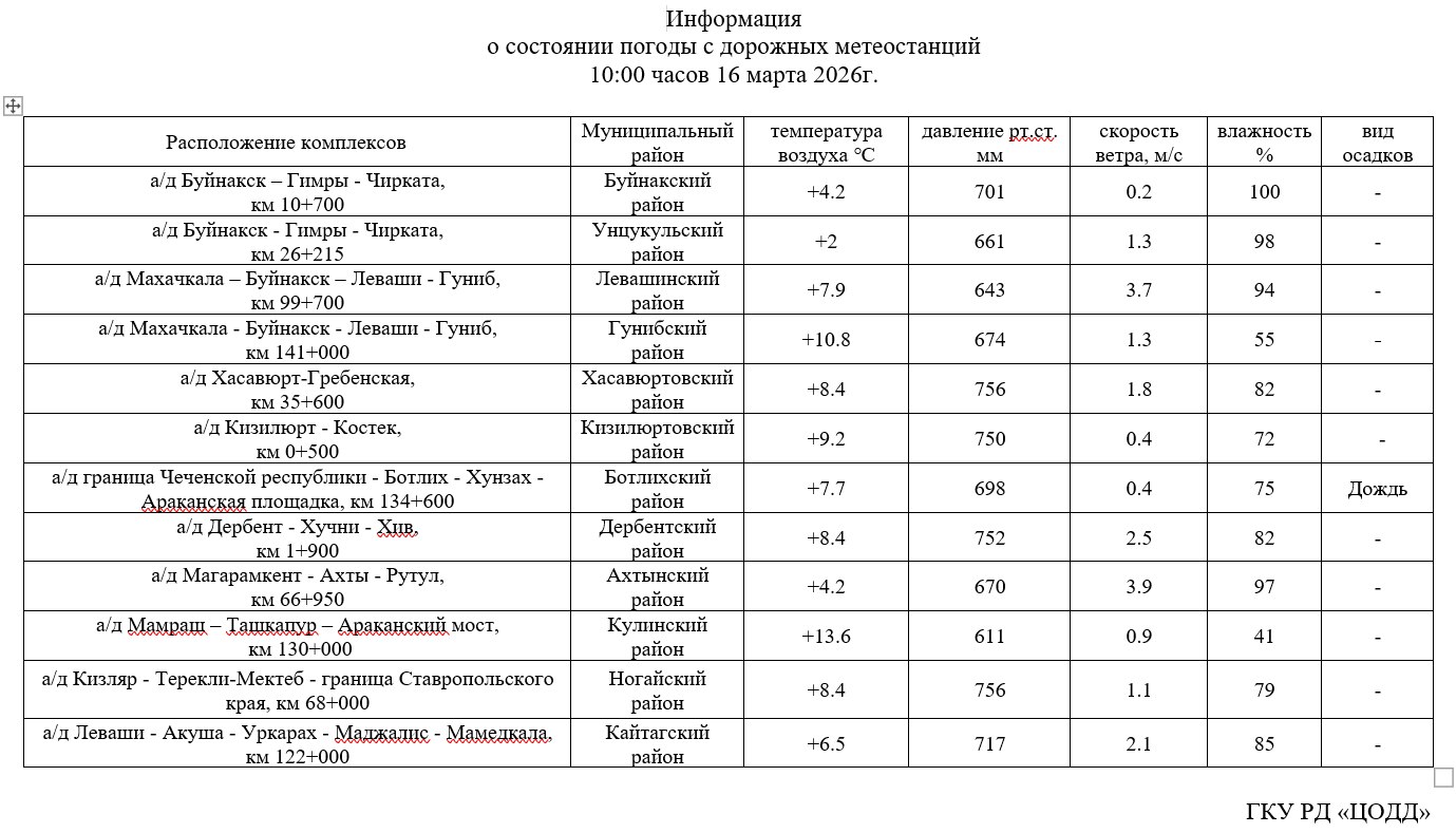 Информация о состоянии погоды с дорожных постов метеоконтроля на 16 март 2026 года.
