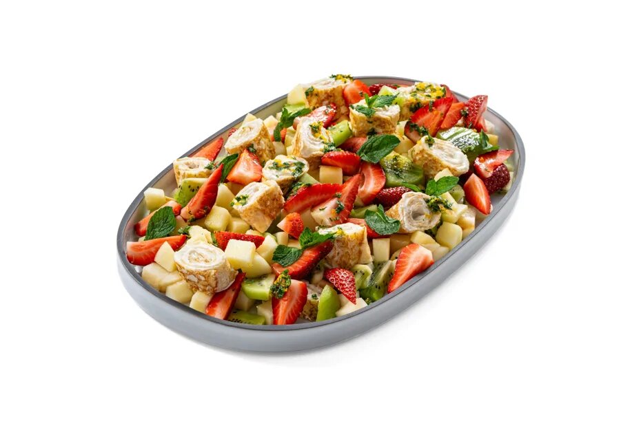 Этот несомненно аппетитный десерт, состоящий из блинов, фруктов, меда и сметаны, преображается благодаря необычной подаче. Тонкие блинчики, смазанные сметаной, сворачиваются в рулеты и нарезаются на яркие диагональные кусочки, плавно погружаясь в ассортимент сочных фруктов. Меняйте набор фруктов по своему усмотрению: от предпочтений до пищевых аллергий — блинно-сметанные рулетики отлично подойдут к любым сочетаниям. В этом рецепте особенно гармонично смотрится микс: нежные яблоки и груши, к кислой сладости киви и всевозможная клубника.