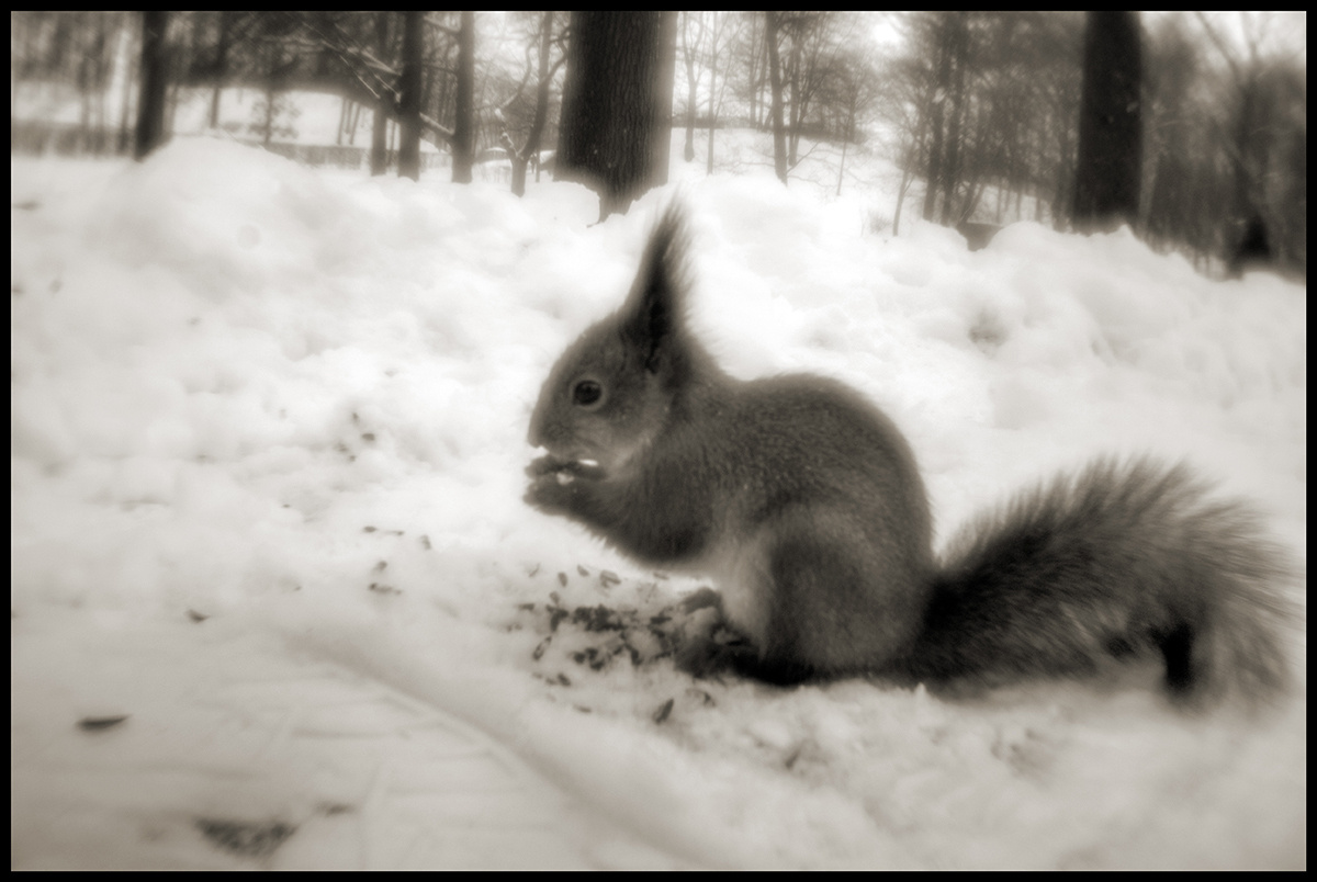 Прошлой зимой, а точнее, несколько лет назад, в Нижнем парке Петергофа развернулась забавная история. На учебной фотосъемке с учениками в зимнем пейзаже неожиданно появилась белка, старая знакомая здешних мест. Как всегда, она не проявила ни капли страха и с уханием просила орехи и семечки у прохожих. В летом белок, как правило, не так много, но зимние месяцы дают им возможность блистать. Ждущая момента, чтобы продолжить учебу, группа увлеклась игрой, а преподаватель решила запечатлеть это на камеру.