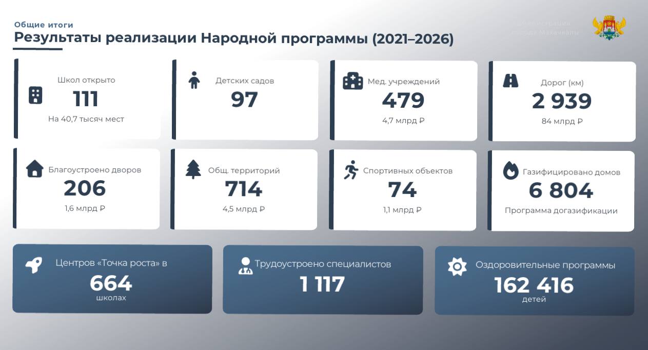 Важно отметить, что все 20 направлений программы реализуются и в Махачкале. Это благоустройство дворов и общественных территорий, строительство и ремонт школ и детских садов, развитие дорожной инфраструктуры и другие меры.