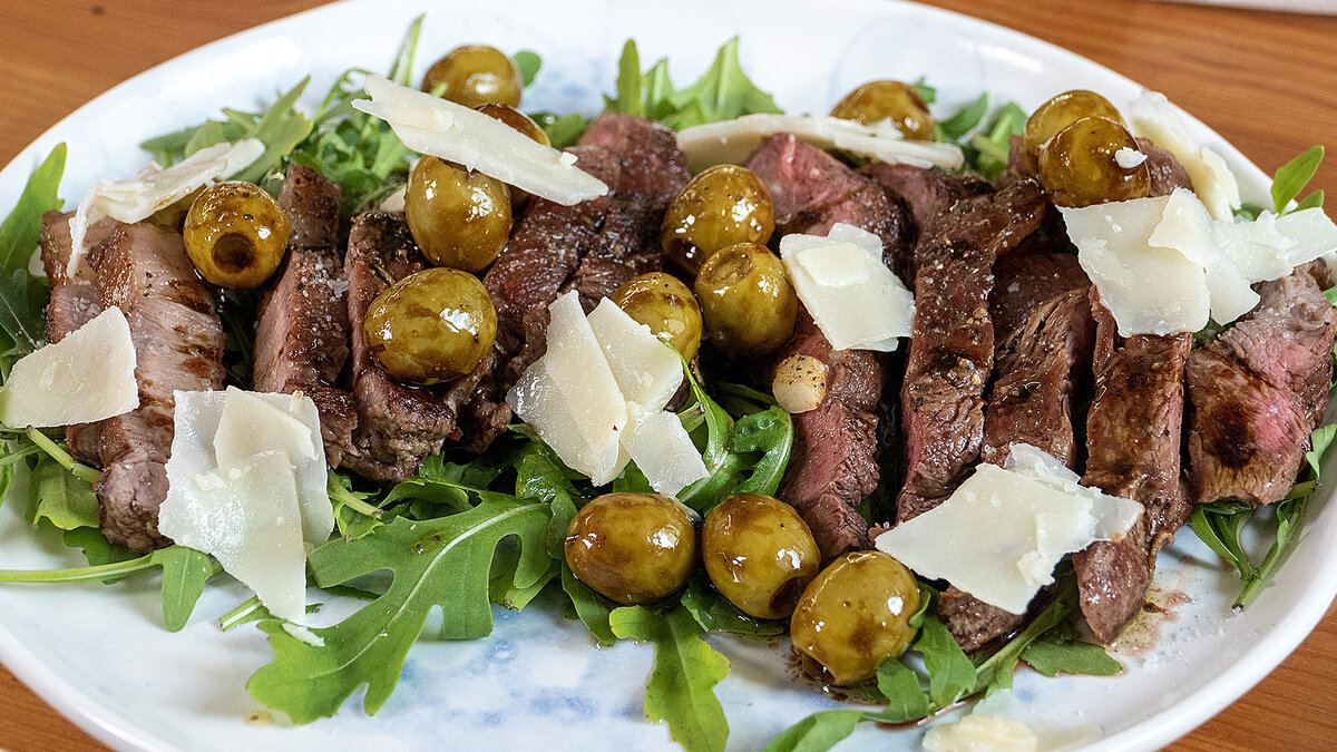 Перед подачей не забудьте посолить и поперчить стейки. Выложите их на подушку из рукколы и щедро полейте соусом. Чтобы создать финальный аккорд, украсьте готовое блюдо тонко нарезанным пармезаном и хрустящим жареным луком. Приятного аппетита!