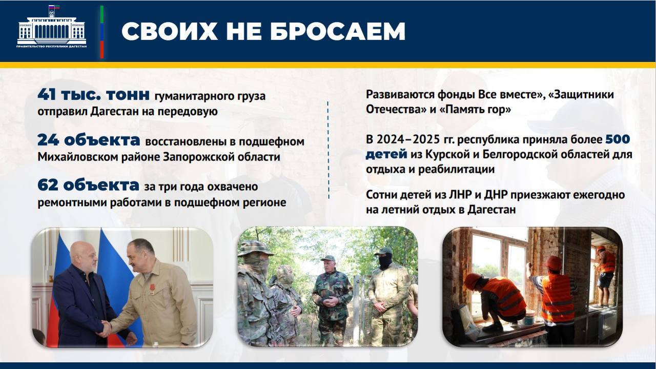 «Нами оказывается необходимая помощь участникам СВО и членам их семей. Развиваются фонды Все вместе», «Защитники Отечества» и «Память гор», сотни детей из ЛНР и ДНР приезжают ежегодно на летний отдых в Дагестан. Так, например, в 2024–2025 году республика приняла более 500 детей из Курской и Белгородской областей для отдыха и реабилитации»,