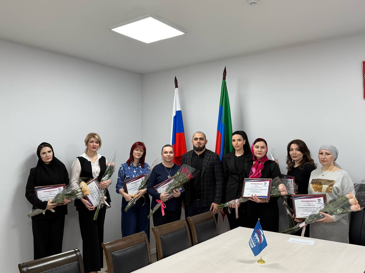 От имени Председателя Собрания депутатов городского округа «город Каспийск» восьмого созыва,секретаря Каспийского местного отделения Партии «Единая Россия» Абдулвахид Джаватов виновникам торжества были вручены благодарственные письма и цветы.