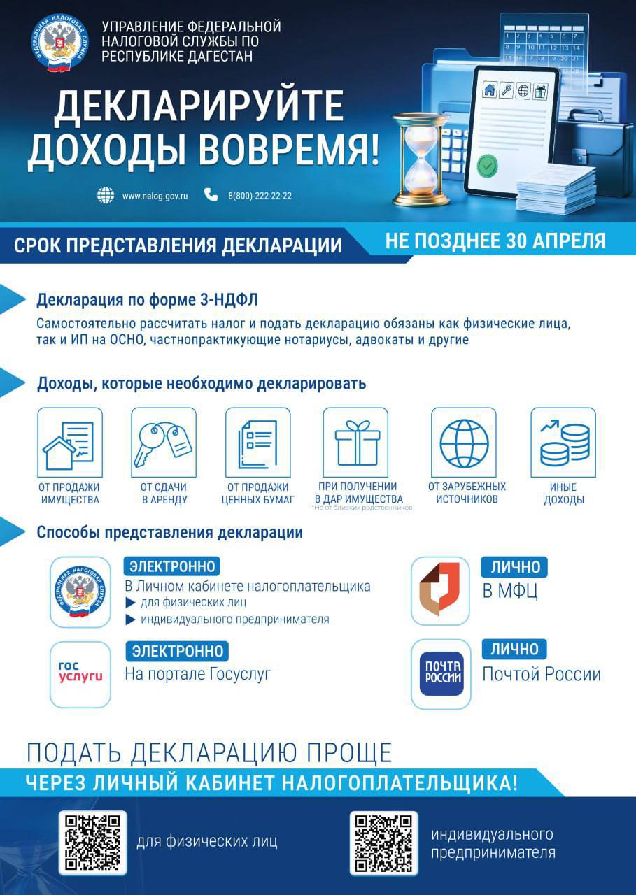 Федеральная налоговая служба напоминает о необходимости своевременно задекларировать полученные доходы.