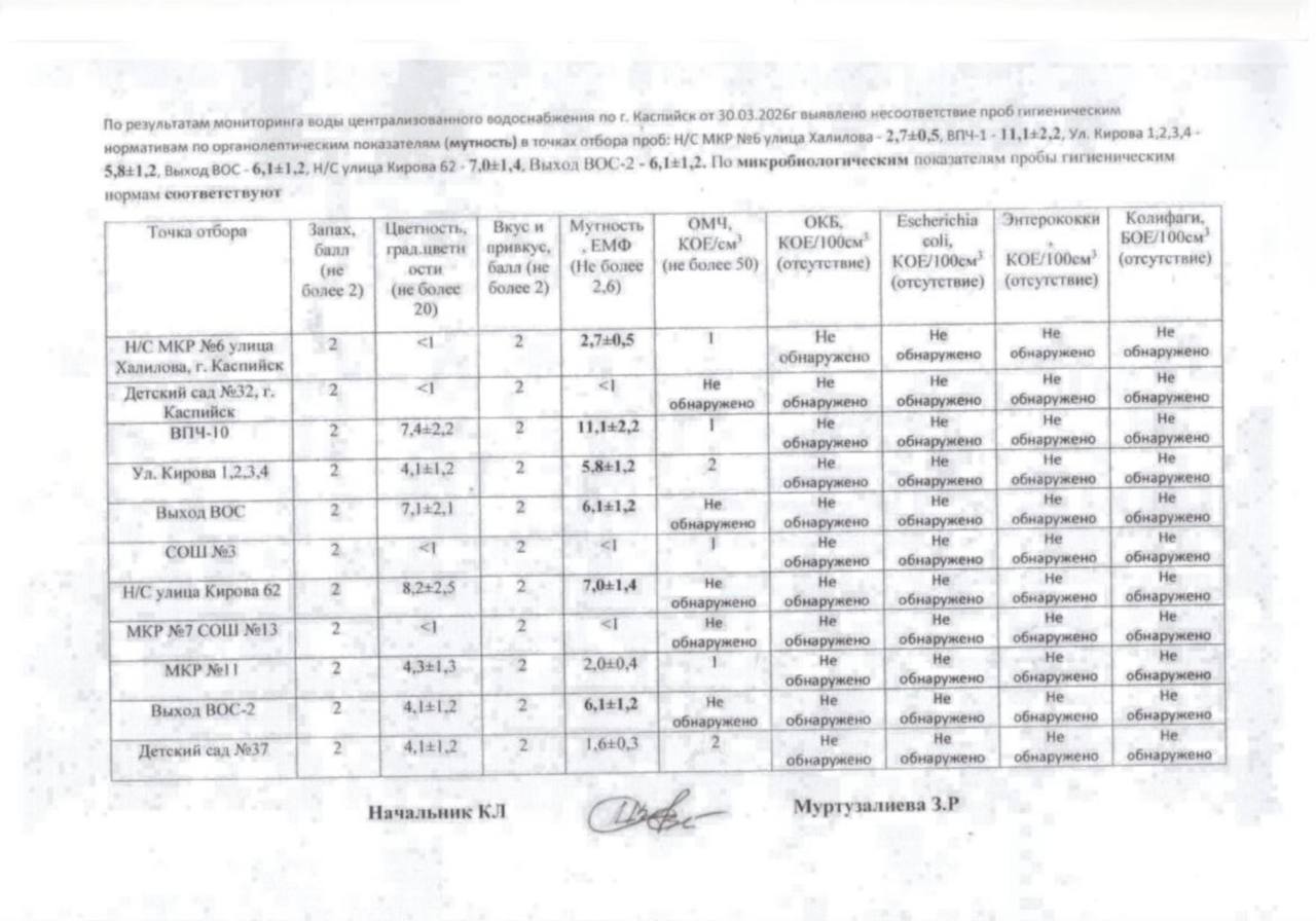 В соответствии с проведёнными мероприятиями по контролю качества питьевой воды, специалистами Роспотребнадзор были отобраны и исследованы пробы воды на территории города Каспийск.