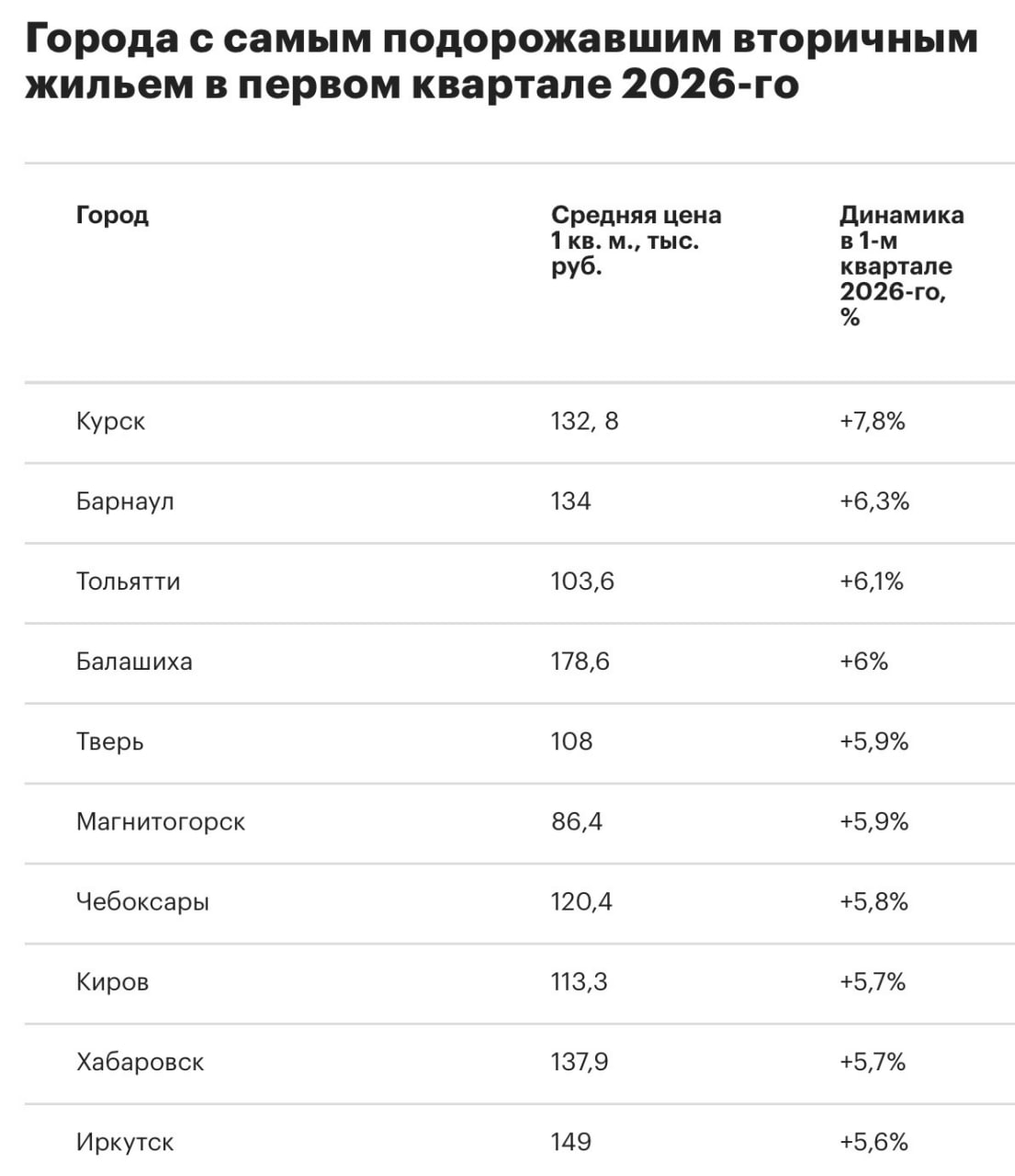 По итогам первого квартала 2026 года вторичное жилье подешевело только в двух из 50 исследуемых крупных российских городов — в Сочи (почти на 1,4%, до 305,5 тыс. руб. за кв. м) и Махачкале (на 0,3%, до 126,1 тыс. руб.). В остальных 48 городах вторичка подорожала, подсчитала «РБК Недвижимость» на основе данных компании SRG.