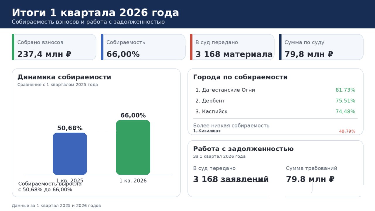 В Дагестане по итогам 1 квартала 2026 года на капитальный ремонт многоквартирных домов было начислено 359,7 млн рублей, а на счета Фонда поступило 237,4 млн рублей. Общая собираемость составила 66,00%.