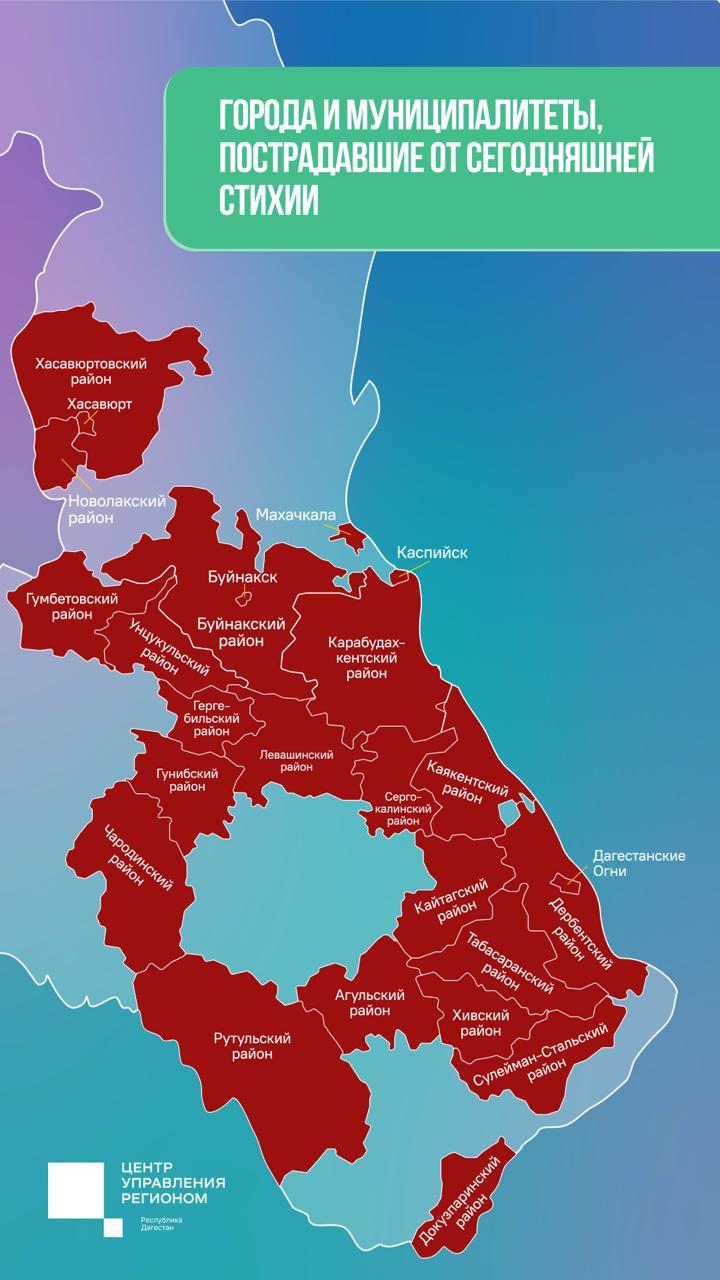 ЦУР Дагестана представил тепловую карту, отражающую города и районы республики, пострадавшие от стихии.