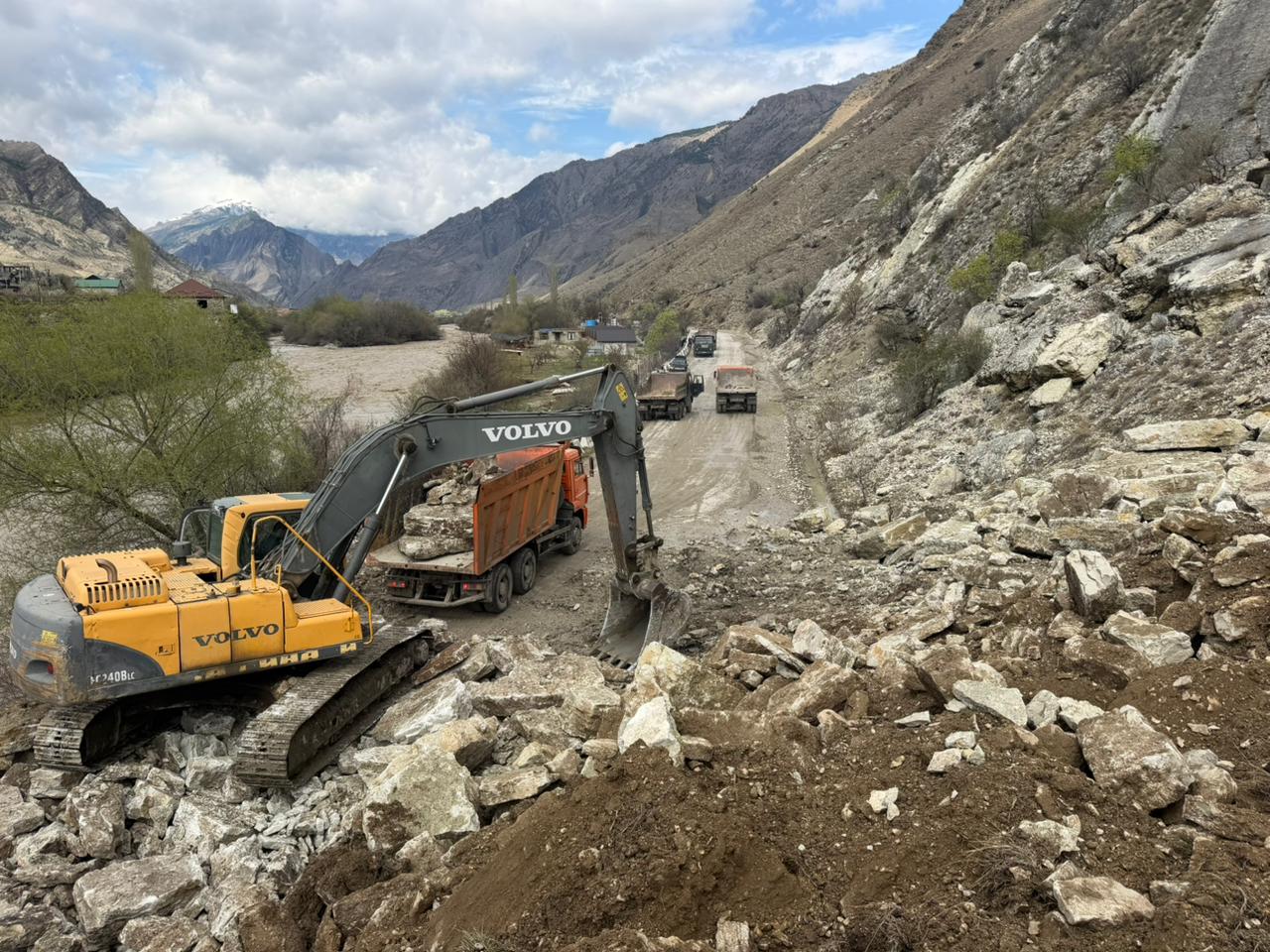 В Гергебильском районе на участке км 203 (в районе с. Кикуни), где 5 апреля произошел обвал скальных пород верхового откоса продолжаются работы по расчистке.