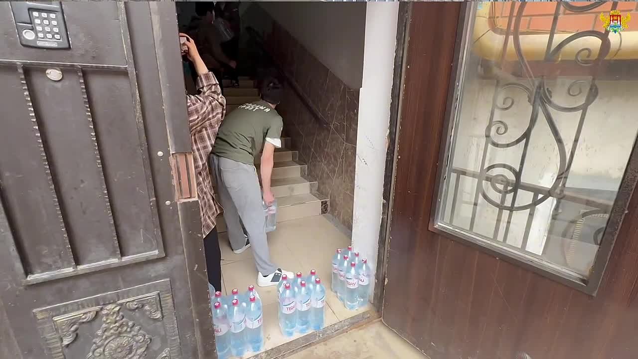 - Группа из 10 человек помогает в разгрузке и доставке воды.