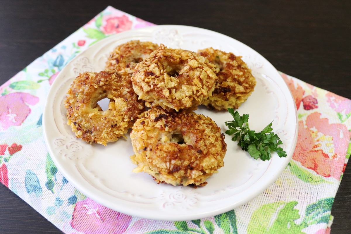 2. Измельчите кукурузные хлопья в крошку. Это можно сделать с помощью толкушки в глубокой миске или покатав их в пакете с помощью скалки. Затем сформируйте круглые котлетки с отверстием посередине.