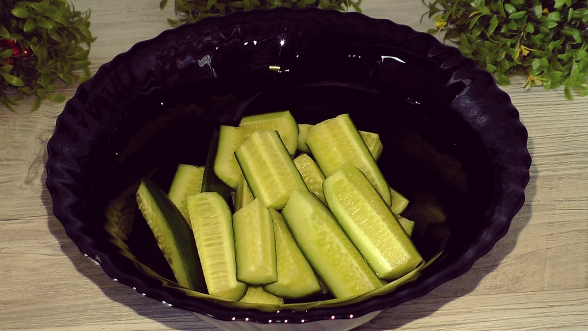 Первый шаг к созданию этого кулинарного шедевра - нарезка огурцов. Их следует нарезать брусочками, а помидоры - на 4-6 долек. Все овощи отправляются в одну емкость.