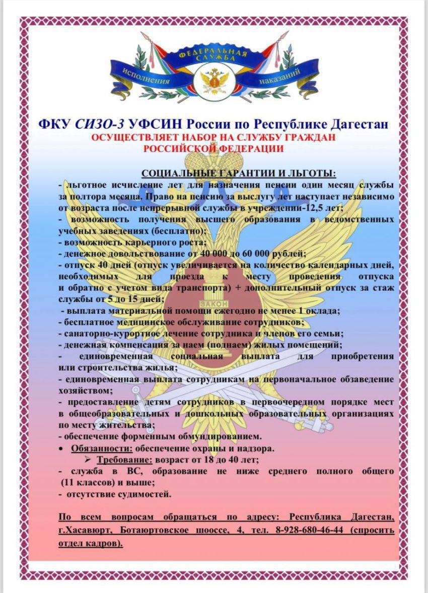 В ФКУ СИЗО-3 УФСИН России по Республике Дагестан (г. Хасавюрт) проводится набор граждан на службу.