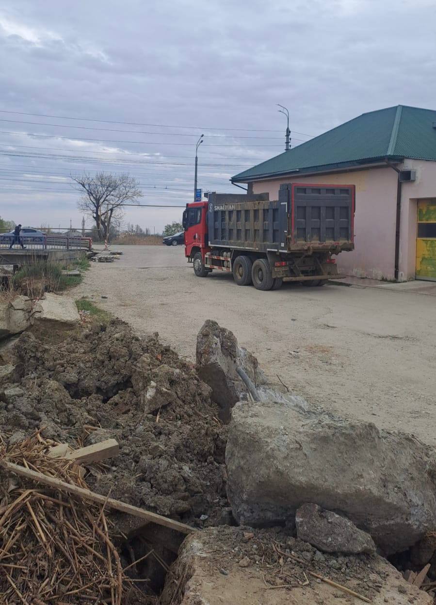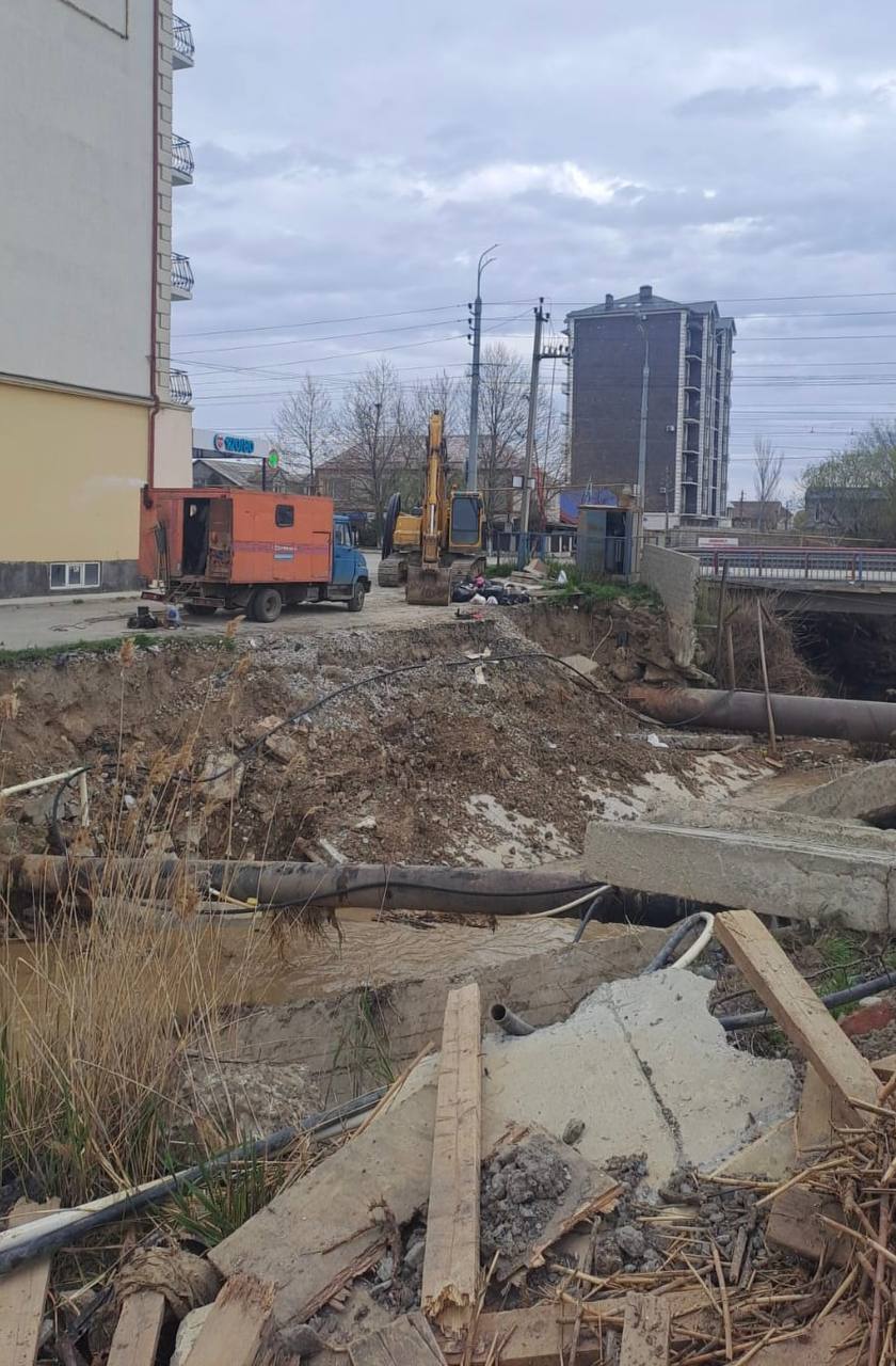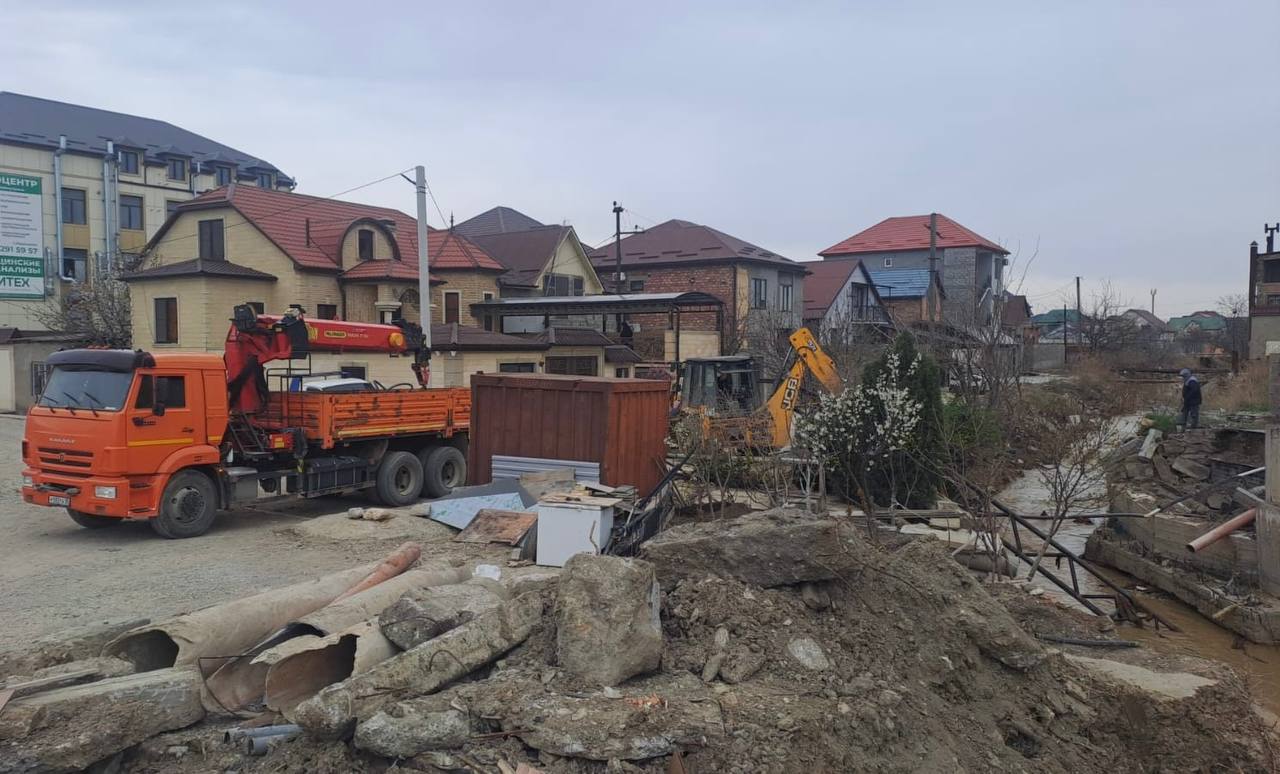 На фото — работы, проводимые на реке Черкес-Озень. Чтобы не допустить разрушения берегов и подтоплений, работы ведутся круглосуточно. Задействована тяжелая техника и дополнительные бригады.