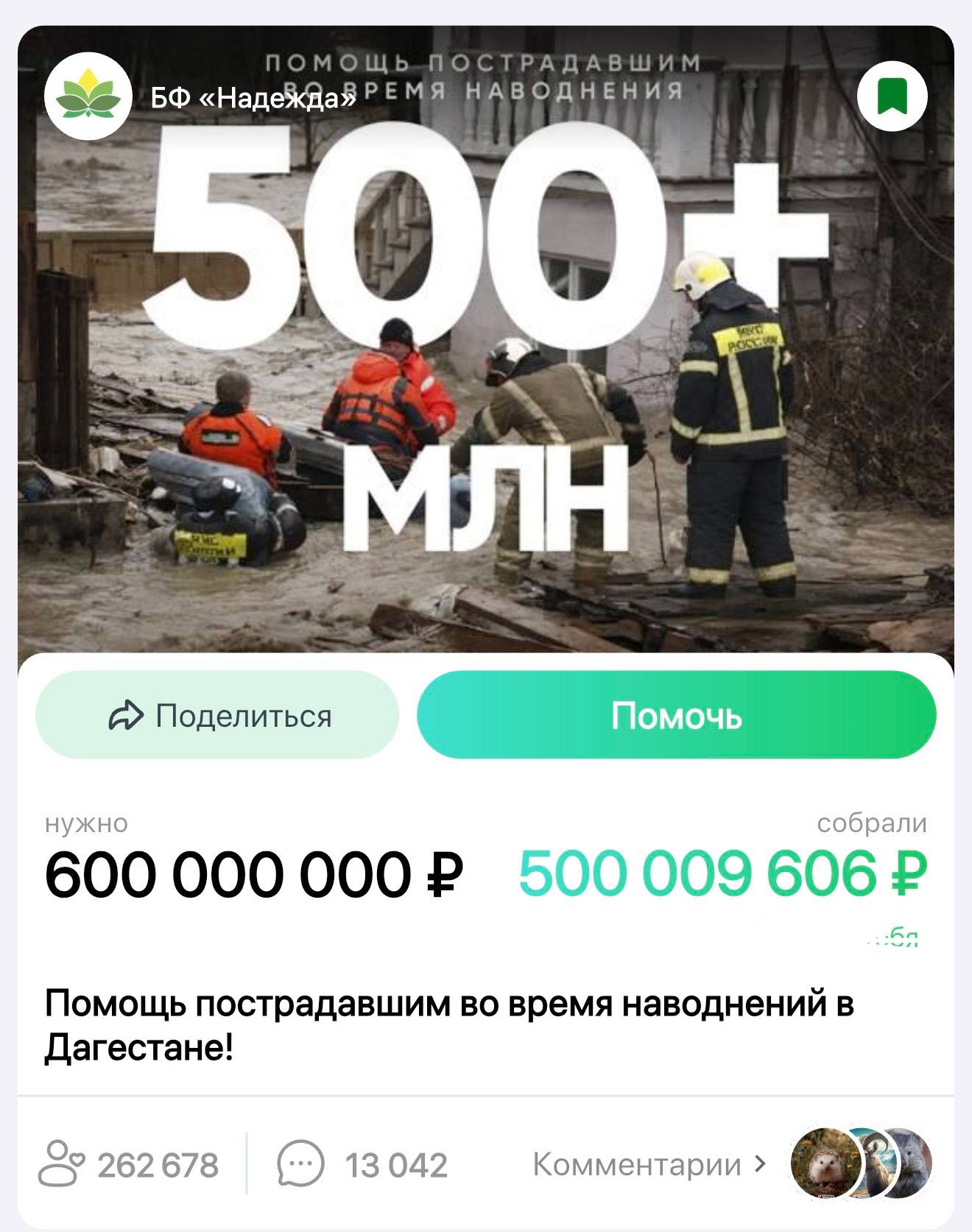Фонд «Надежда» за считанные дни собрал 500 миллионов рублей для оказания помощи пострадавшим от наводнения в Дагестане на платформе «Tooba».