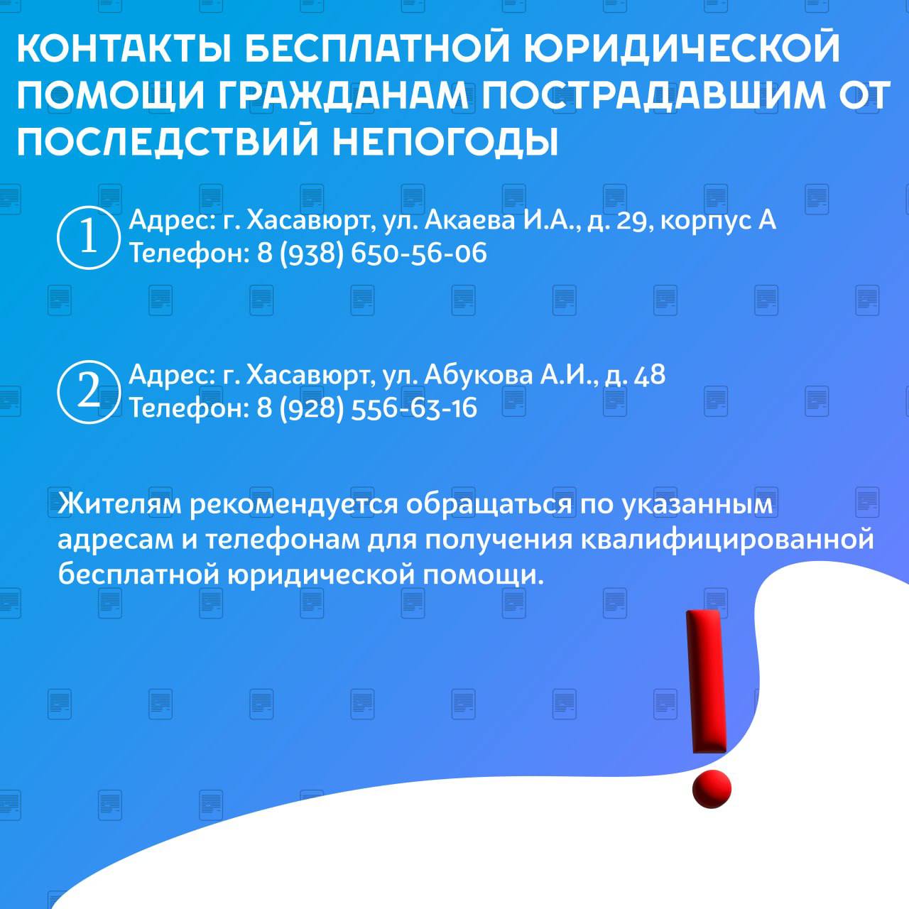 В соответствии с частью 1 пункта 8 статьи 20 и частью 2 пункта 16 статьи 20 Федерального закона от 21 ноября 2011 года № 324-ФЗ «О бесплатной юридической помощи в Российской Федерации», а также частью 3 пункта 6 статьи 9 Закона Республики Дагестан от 14 июня 2012 года № 32 «О бесплатной юридической помощи в Республике Дагестан», граждане, пострадавшие в результате чрезвычайных ситуаций, имеют право на получение бесплатной юридической помощи для защиты своих прав, восстановления имущественных и личных неимущественных прав, а также содействия в возмещении причинённого ущерба.