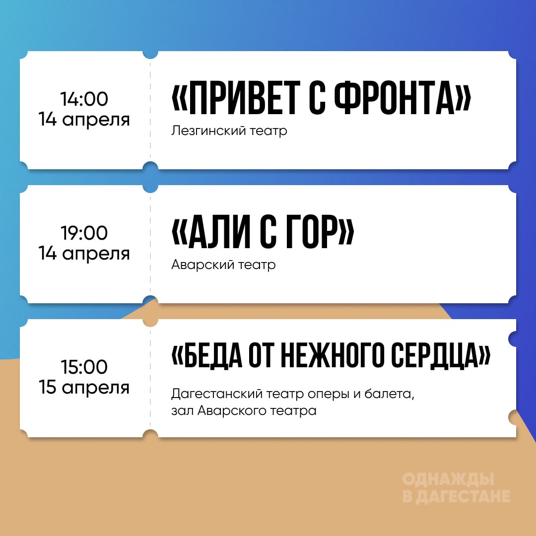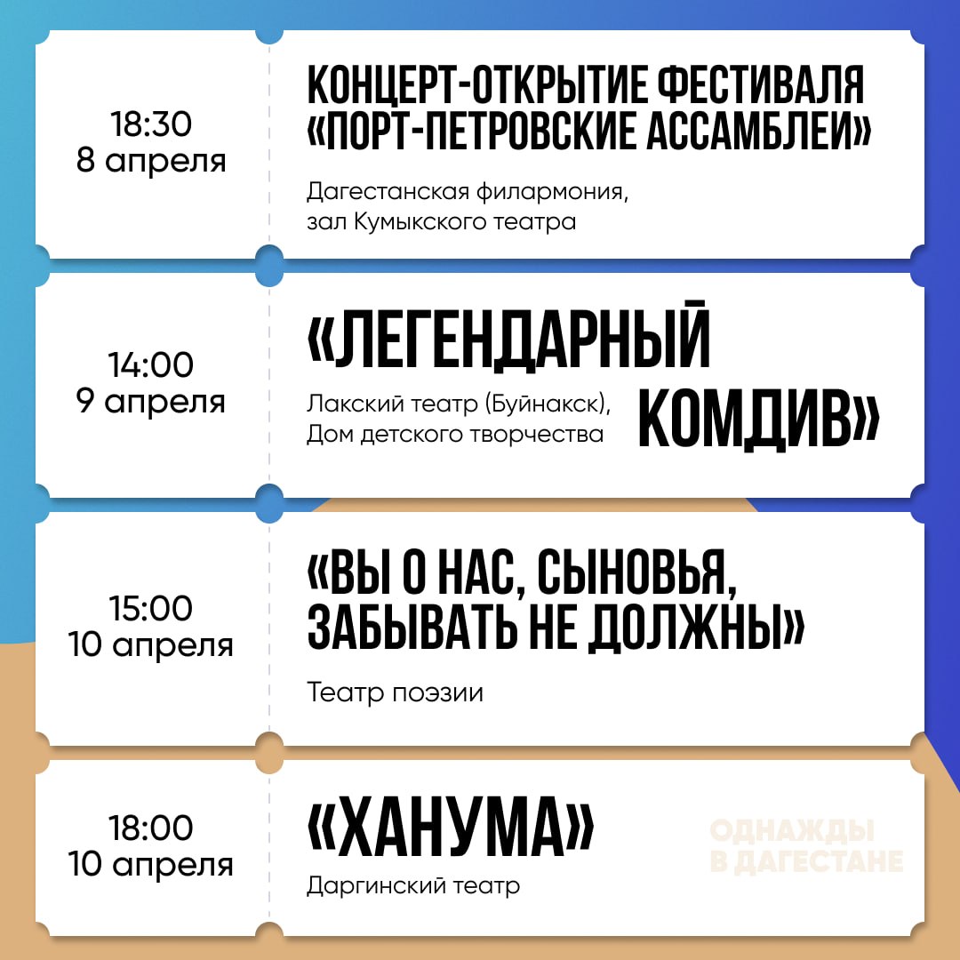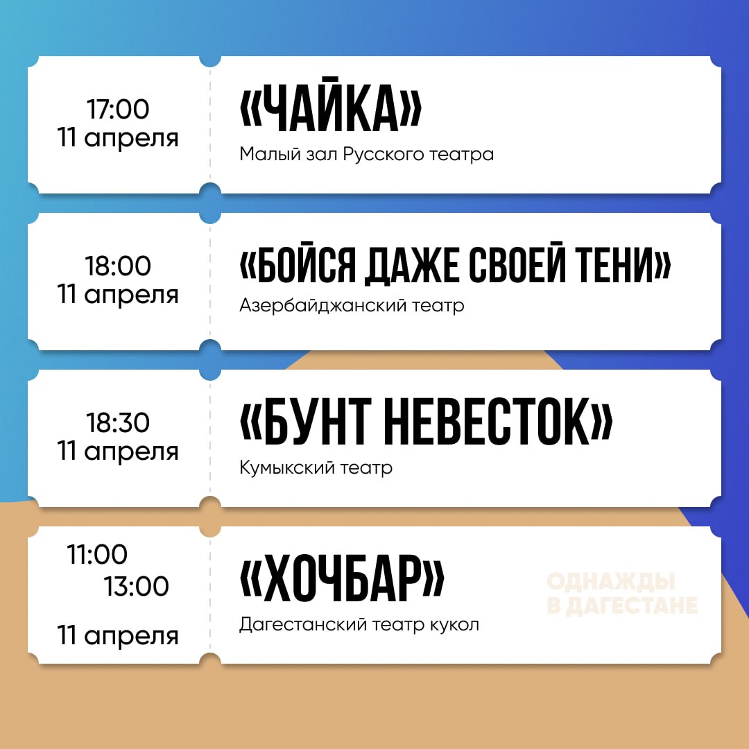 В афише — постановки Русского, Аварского, Кумыкского, Лезгинского, Даргинского театров, Театра поэзии, Театра кукол и других площадок.