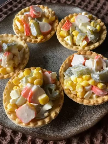 Крабовый салат можно подать не только в традиционном виде, но и в тарталетках. Это отличный способ удивить гостей на новогоднем фуршете. Так вы сможете больше общаться, танцевать и участвовать в играх, а не застревать за столом.