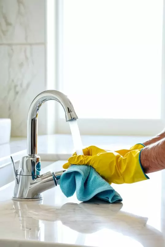 - Уксусный раствор: 2 ст. ложки уксуса на 1 литр теплой воды – эффективный способ, который позволит убрать минеральные отложения и придаст блеск.