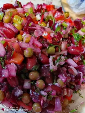 Не забываем о фабрике вкусов — красной консервированной фасоли и зеленом горошке. Эти ингредиенты погружаются в общую массу, создавая яркий микс текстур и вкусов. Все компоненты тщательно перемешиваются, а затем заправляются растительным маслом. Это придаст салату легкость и свежесть. Приправы как соль и перец также можно добавить по вкусу, но стоит помнить о присутствии соленых огурцов и капусты в салате.