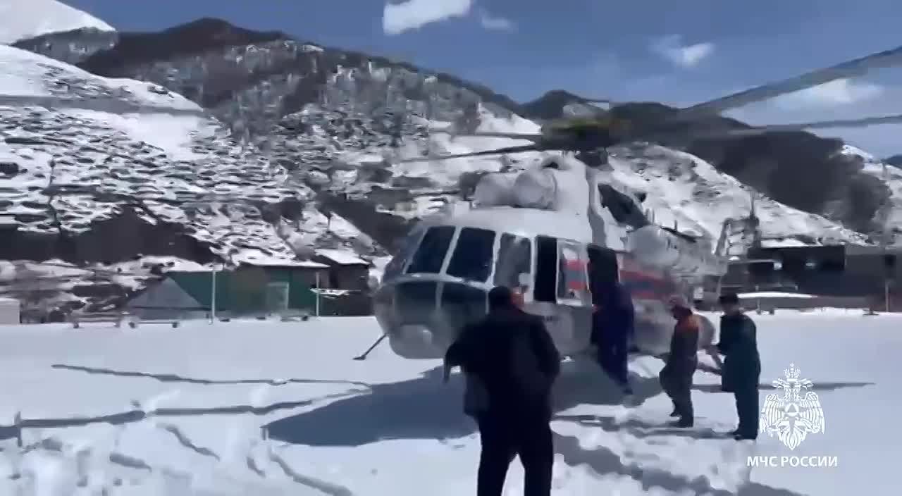 В Бежтинский, отрезанный снегом, спасатели МЧС доставили помощь на вертолёте Ми-8.